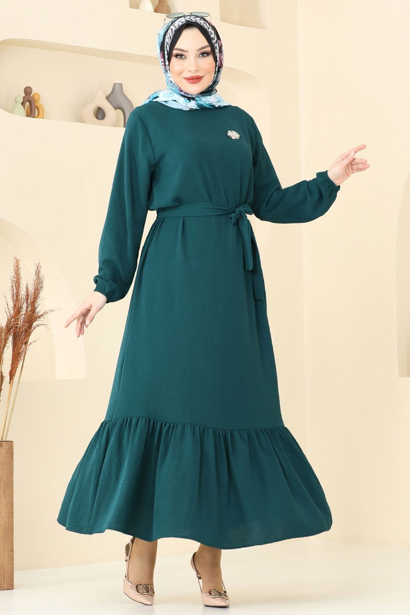 Ürün Açıklaması: Yeni sezonun tesettür moda ürünlerinden biridir. Arka kısmında bulunan düğme ile kapatılabilir. Ürün, Bisiklet yaka tasarımına sahiptir ve astarsızdır. Kemer, opsiyonel olarak kullanılabilir. Ürünle aksesuarlar dahil değildir. Elbisenin manşetleri lastiklidir. Çekim teknikleri nedeniyle renk tonlarında farklılık gösterilebilir.