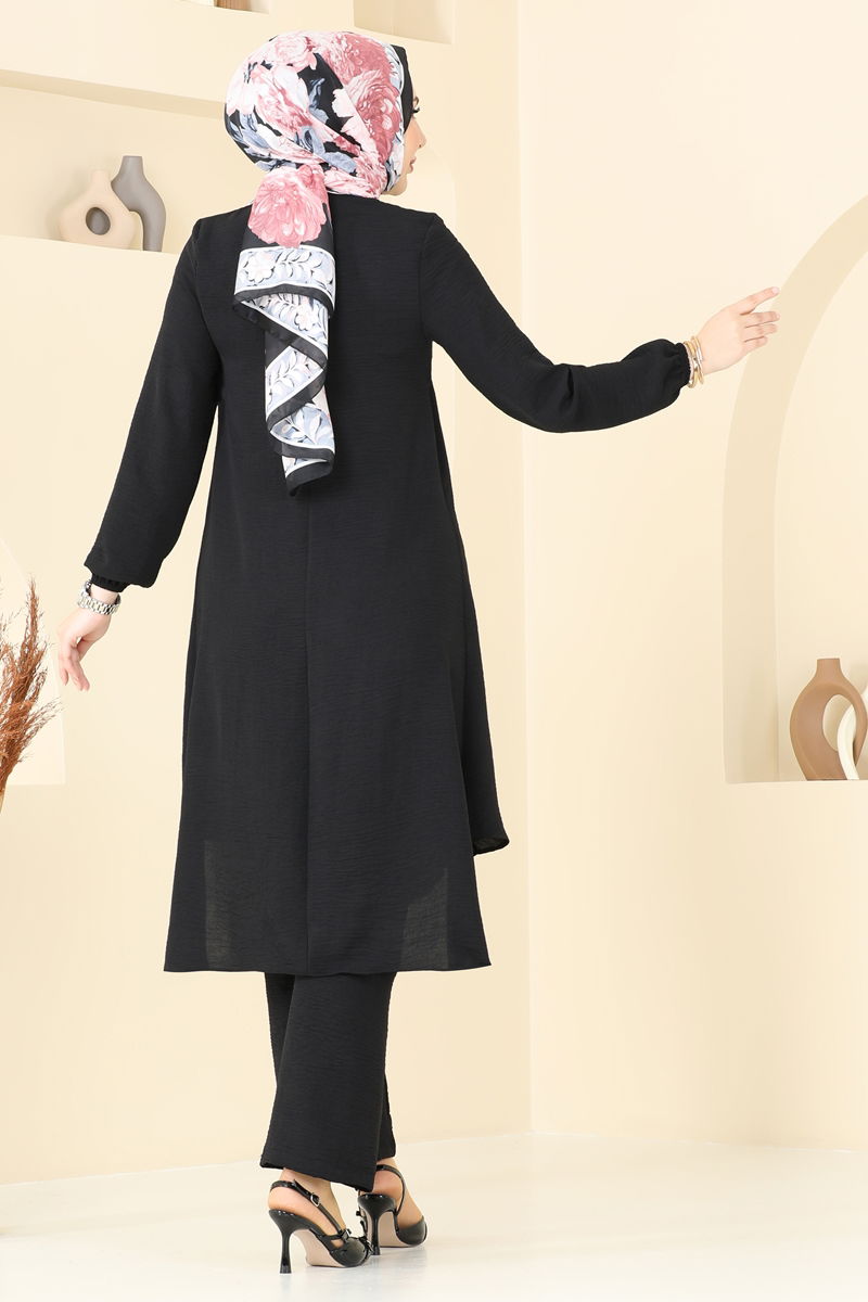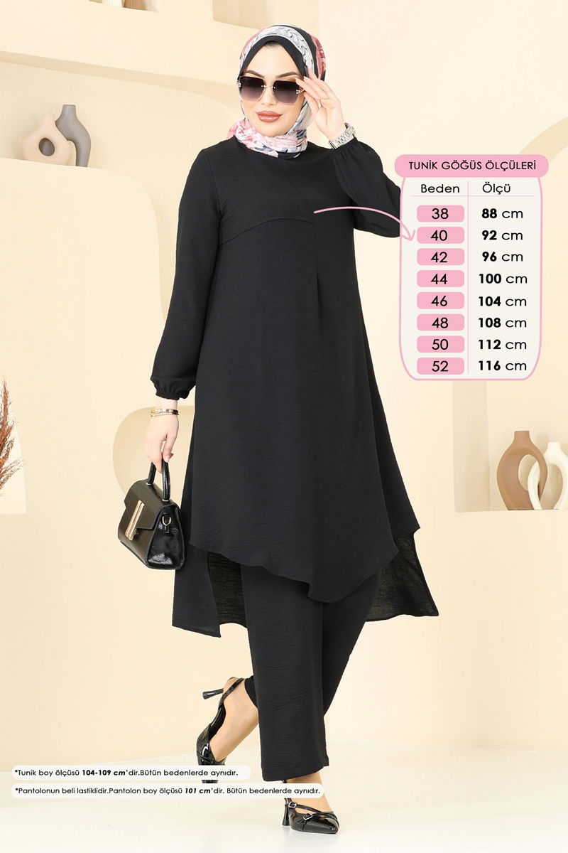 Modern tasarımı ile tesettür giyimde yeni bir dönem başlatan Elastik Manşetli Siyah Aerobin Takım, dört mevsim boyunca konforlu bir kullanım sunar. Hassas yıkama özelliği ile bakımı kolaydır. Aerobin kumaşın hafif ve hava alabilir özellikleriyle tüm gün rahatlık sağlar. Bisiklet yakalı ve yan yırtmaçlı tunik, sırt detaylı düğme ile şıklık katarken, lastikli beli sayesinde esnek bir oturuş sunar. Pantolonun ve tuniğin elastik manşetleri ise giyimi daha pratik hale getirir. Modelin giydiği ürün 38 bedendir.