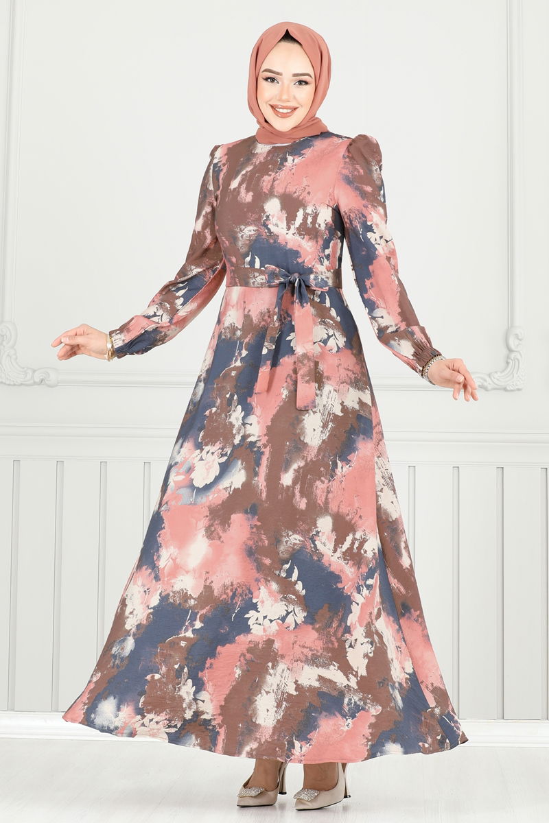 Manşeti Lastikli Desenli Elbise 9034S324-MS Pudra