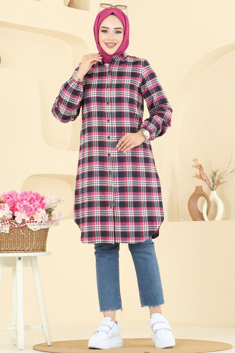 Manşeti Lastikli Ekose Tunik 4123PM271-MS Fuşya