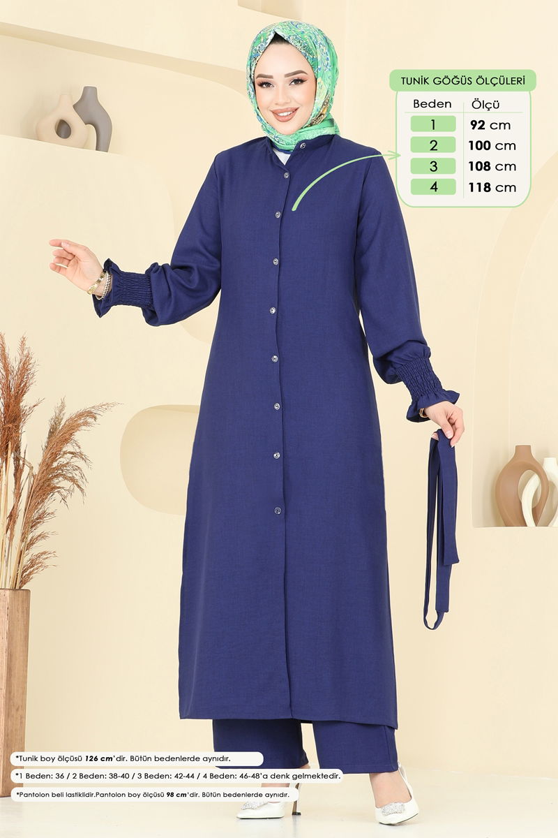 Elastik paçalı ve sofia keten kumaştan tasarlanmış bu zarif takım, yıl boyunca konforla kullanılabilir. Tunik ön kısmı düğmeli, yanları yırtmaçlı ve kumaş kemer içermektedir. Pantolon ise lastik bel yapısıyla rahat bir kullanım sunar. Her türlü ortamda şıklığınızı korumanız için ideal bir seçimdir.