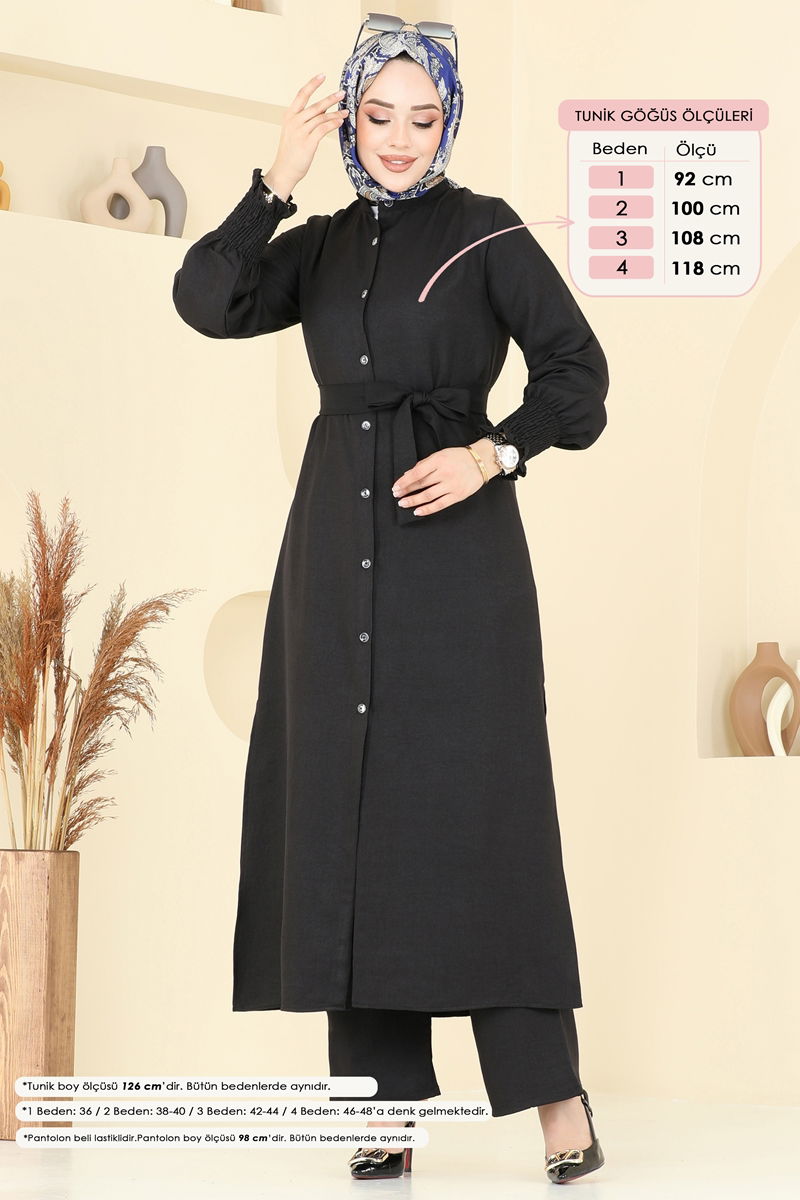 Ürün Detayları : Tesettür moda koleksiyonuna ait yeni sezon ürünüdür. Yaka kısmı düğmeli mandarin yakadır. Tunik ön kısmından düğmelerle açılabilir. Yan kısımlar yırtmaç detaylıdır. Astarsız tasarımdır. Kemer, kullanımı kişisel tercihe bırakılmış şekilde tasarlanmıştır. Bluz sete dahil değildir. Styling örneği olarak kombinlenmiştir. Aksesuarlar pakete dahil değildir. Pantolon beli elastik tasarımlıdır. Pantolonun etek kısmı elastik manşetlidir.Renk tonlarında çekimlerden dolayı farklılık olabilir.