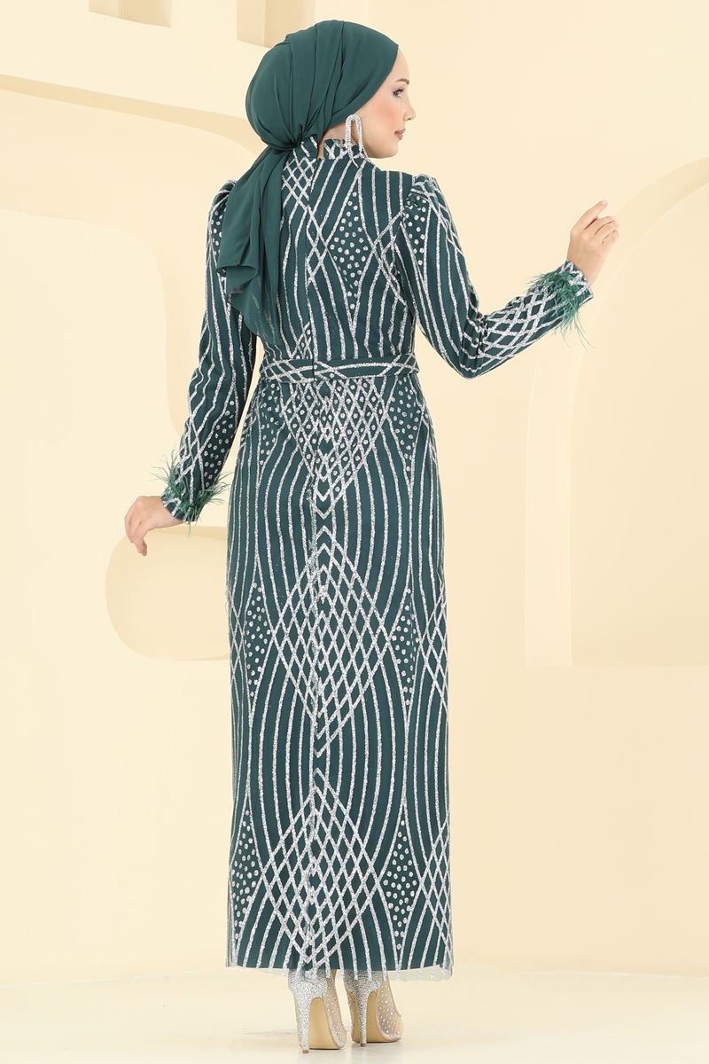 Zümrüt Renkli, Tüy Detaylı Kalem Kesim Abiye