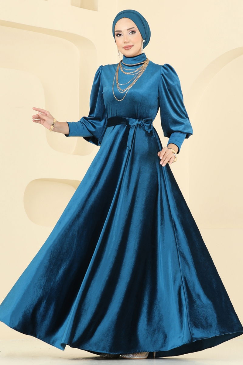 Uzun Kollu Kadife Abiye Elbise - Petrol Rengi