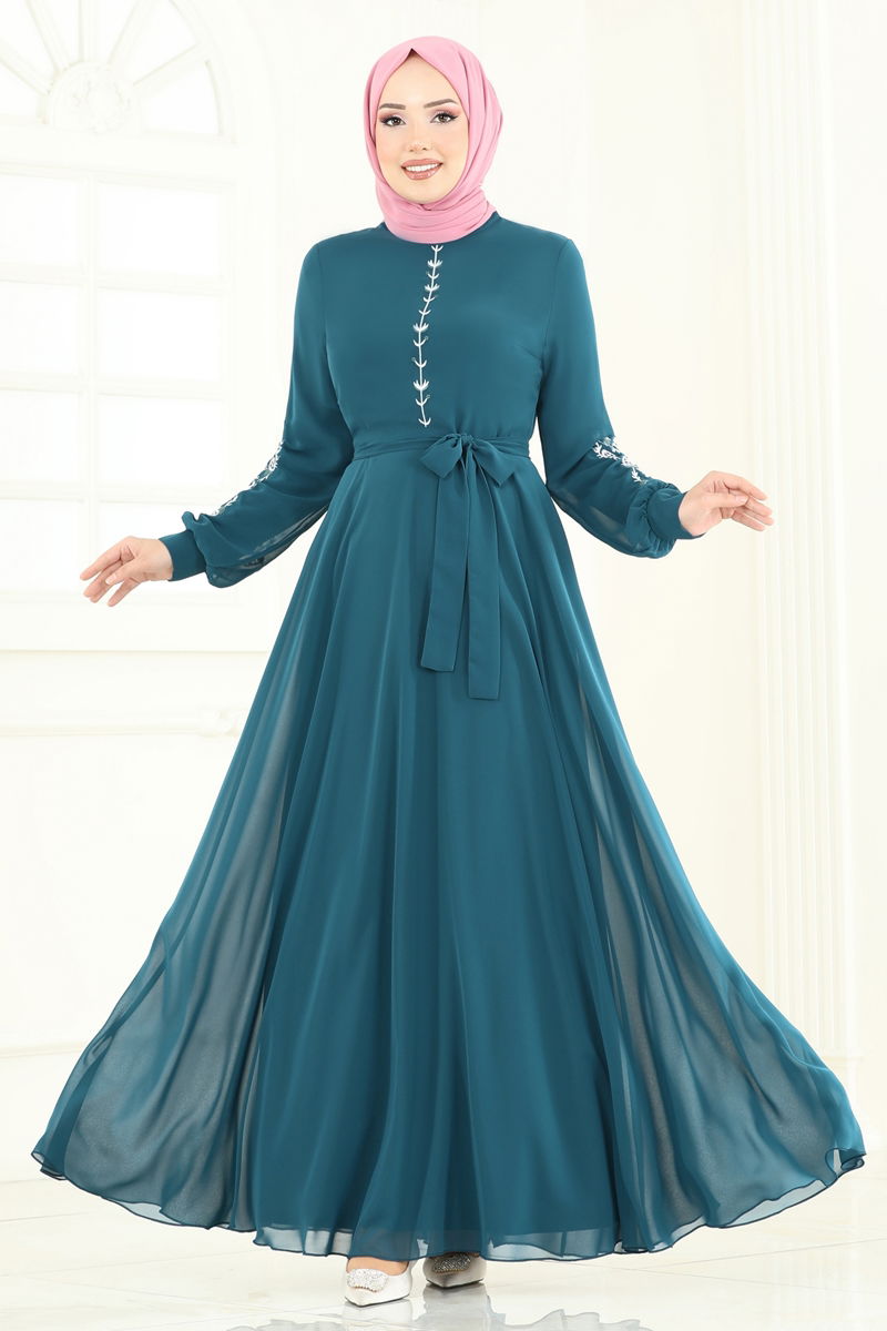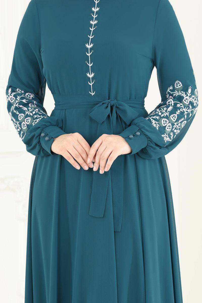 Nakış İşlemeli Şifon Elbise 8022AB368-MS Petrol