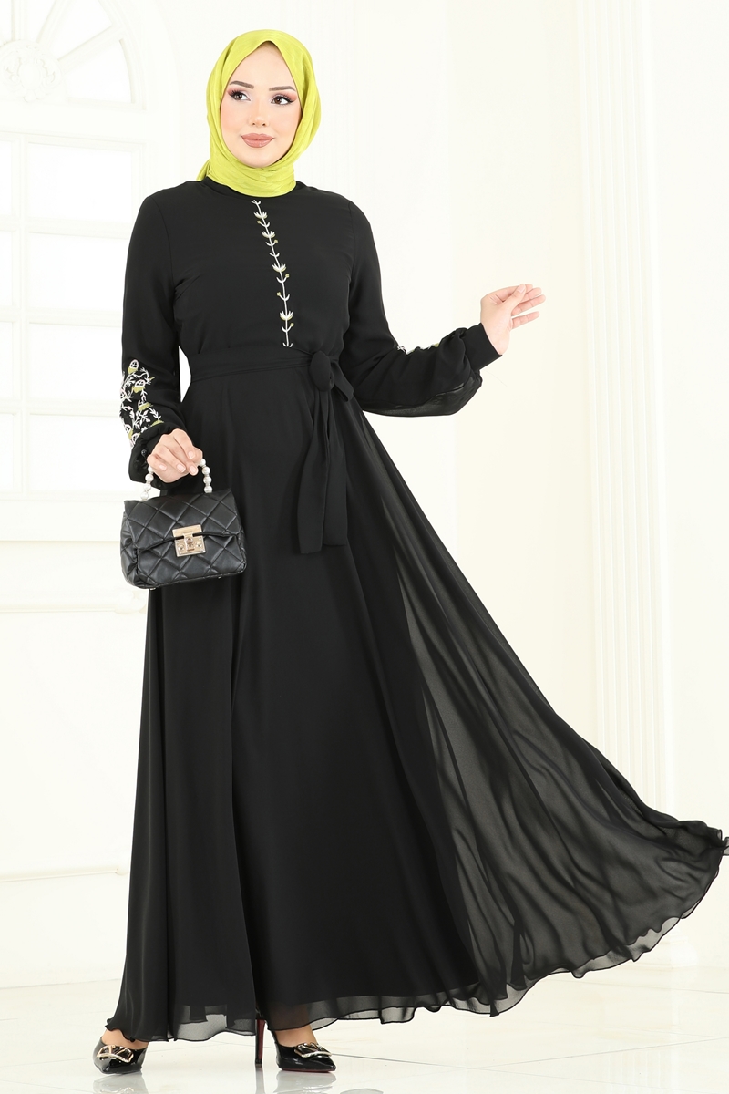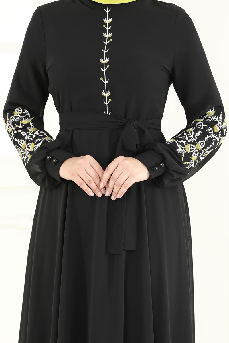 Nakış İşlemeli Şifon Elbise 8022AB368-MS Siyah