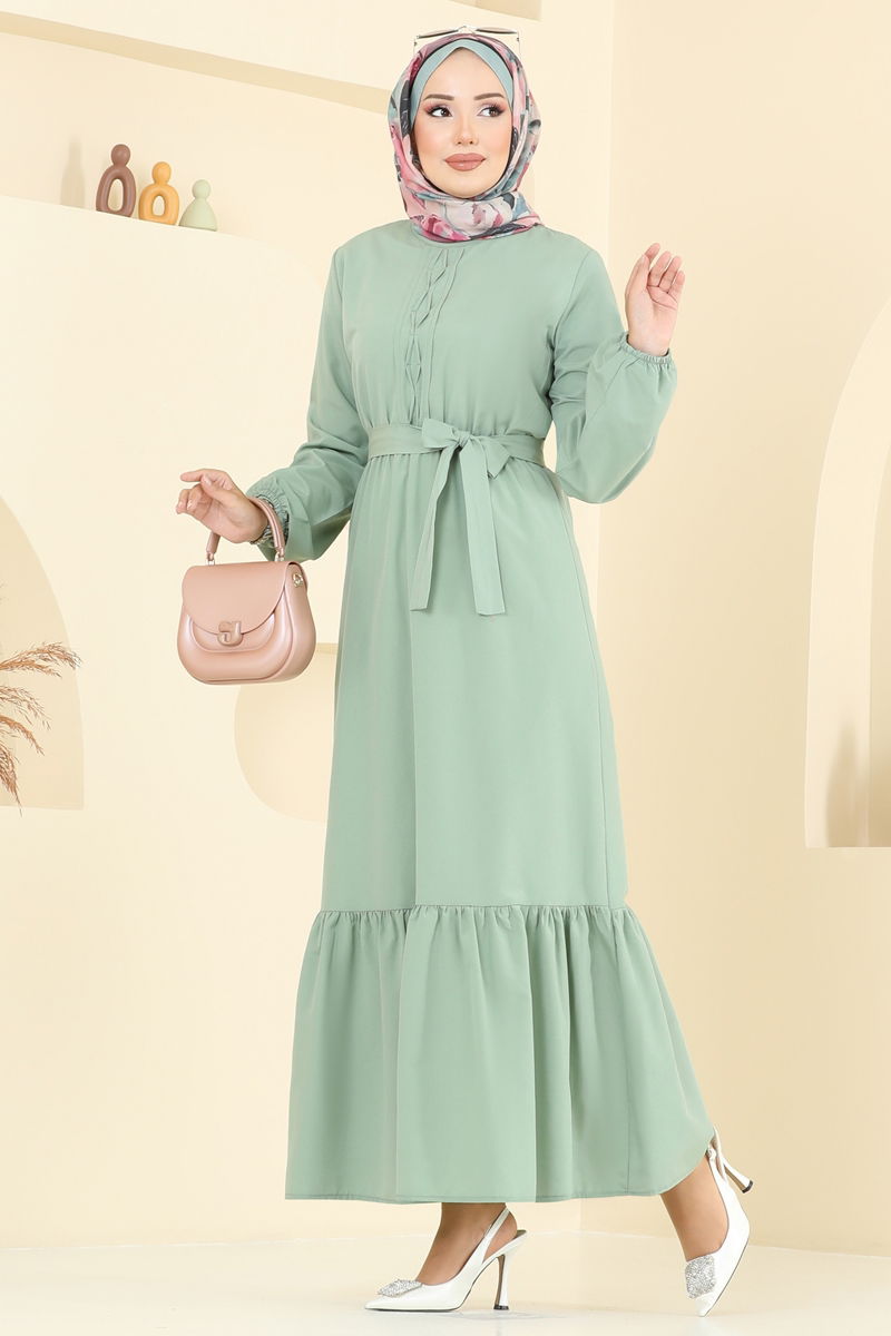 Şal Kodu: 707ART1138Bu mint renkli terikoton elbise ile tesettür giyimde dört mevsim zarafetinizi koruyun! 30 derece hassas yıkama özelliği ile dikkat çeken bu elbise, kullanımın yanı sıra dayanıklı terikoton kumaştan yapılmıştır. Bisiklet yaka ve elastik kol detayları modern bir görünüm sunarken, astarsız yapısı ile maksimum rahatlık sağlar. Elastik bel detayı ile konfor sunar ve arkadan butonla kolayca giyilip çıkarılabilir şekilde tasarlanmıştır. Kemer, farklı bir stil için eklenmiş olup, kullanımı tamamen size bırakılmıştır.
