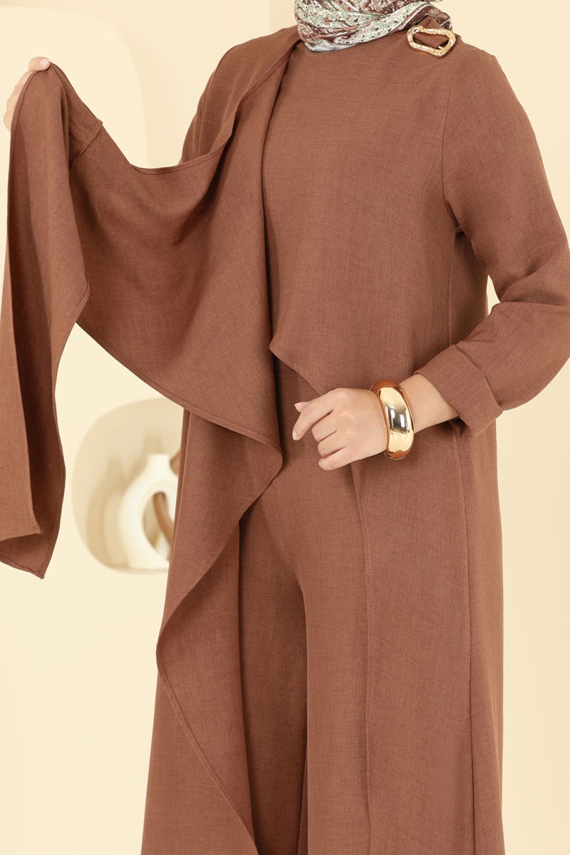 Omuz tokası ile süslenmiş Kahverengi Sofia Takım, şıklığı ve rahatlığı bir arada sunar. Dört mevsim tercih edebileceğiniz bu tasarım, 30 derece hassas yıkama şartlarına uygun, pratik bir kullanım sunar. Bisiklet yakalı tunik, sırtı fermuarlıdır ve rahatlık sağlayan ön yırtmaçlara sahiptir. Pantolon elastik bel tasarımı ile gün boyu konfor sağlar. Sofia ketenin sağlamlığı ve estetiği, bu ürünü mükemmel bir seçim kılar.