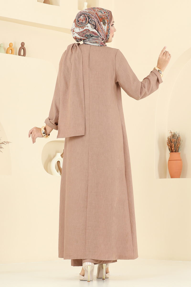Koyu renkli Sofia Keten Omuz Tokalı Takım ile tesettür giyimde modern bir stil oluşturun. Bu takım, tüm sezonlar boyunca keyifle kullanabileceğiniz bir parçadır ve 30 derecede hassas yıkama ile temizlenebilir. Bisiklet yaka sayesinde şık bir profil sunan tunik, yırtmaç detayları ve sırt fermuarı ile işlevsellik kazanır. Lastikli bel pantolon ise hem şık duruşu hem de rahatlığı ile dikkat çeker. Sofia keten kumaşı ile hem kaliteli hem de estetik bir görünüm sunar.