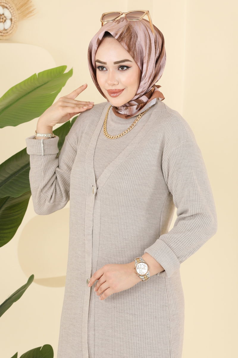 Önden Düğmeli Elbiseli Triko Takım 3080KLB1050-MS Taş