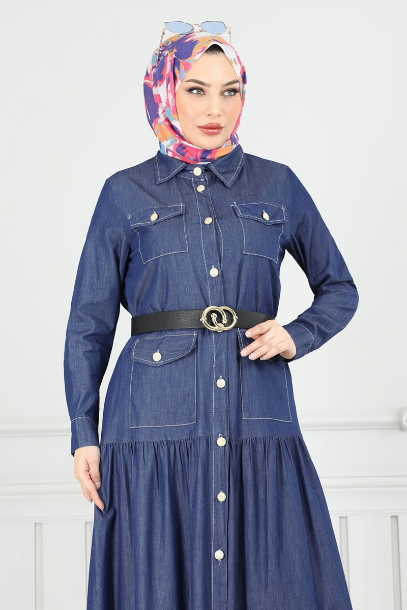 Önden Düğmeli Kot Elbise 0332MSA980-MS Koyu Kot