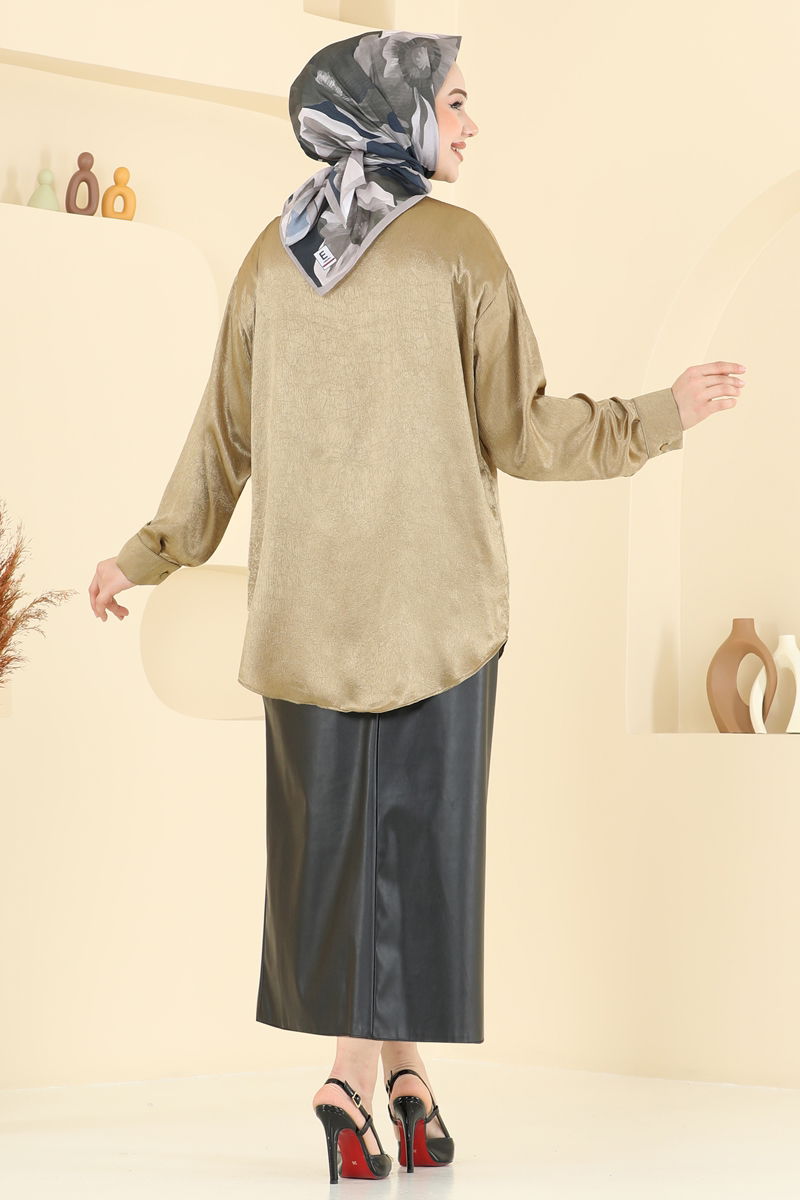 Saten Dokulu Önden Düğmeli Gömlek - Koyu Vizyon Modeli