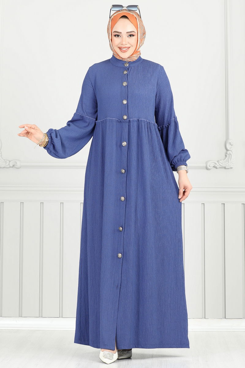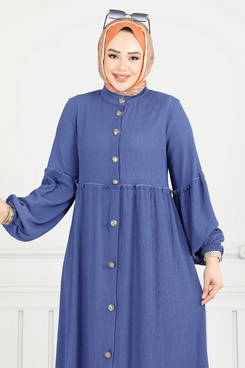 Önden Düğmeli Tesettür Elbise - İndigo Rengi