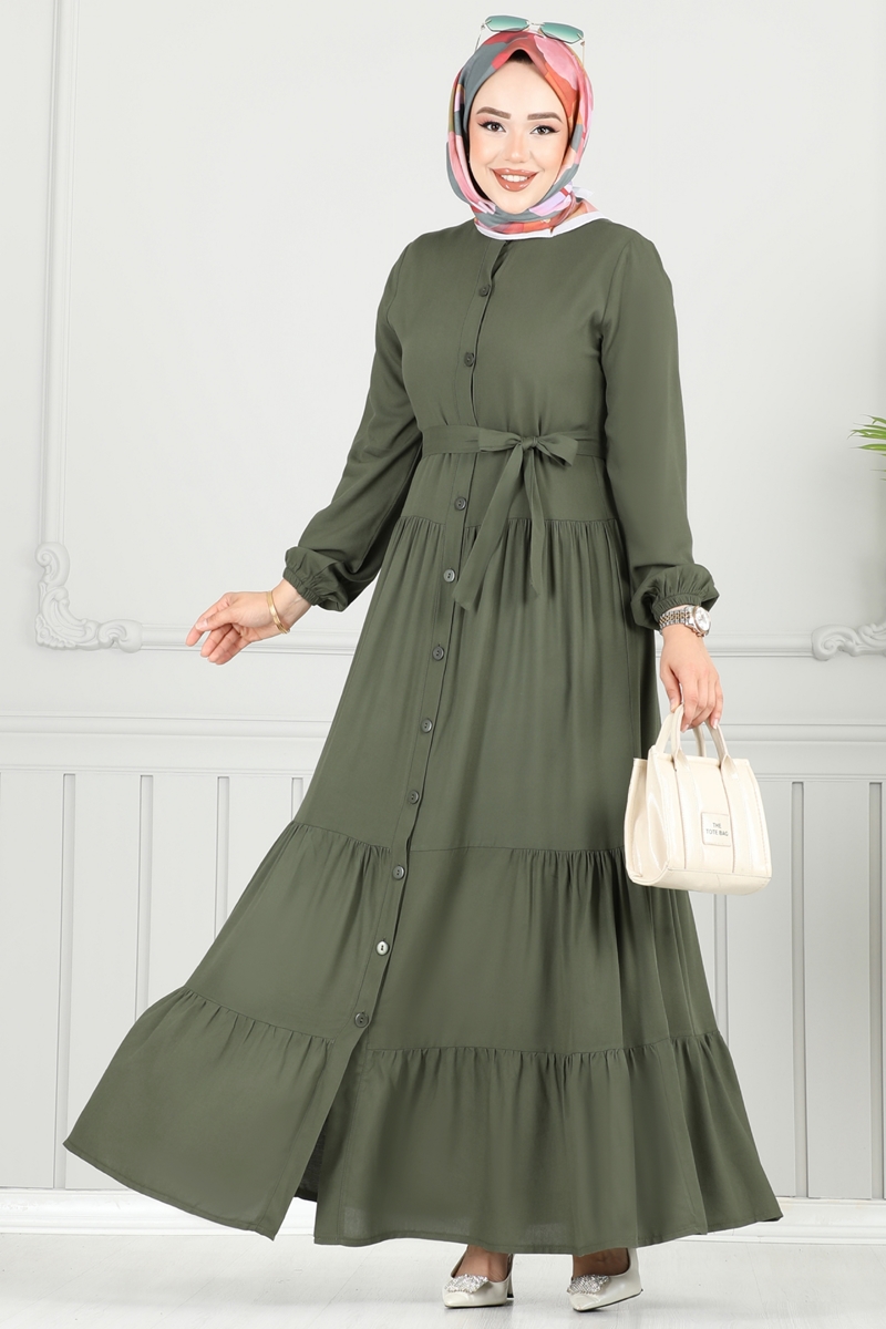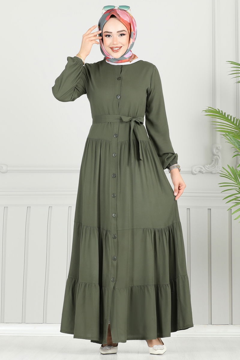 Önden Düğmeli Viskon Elbise 1124BG354-MS Haki