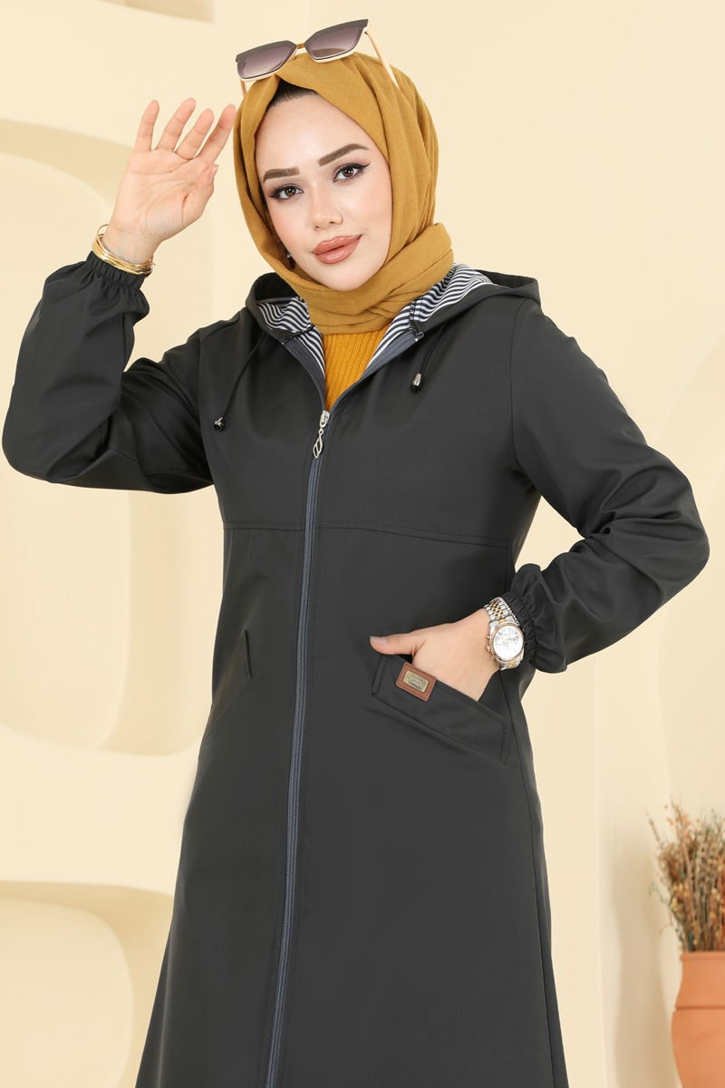 Antrasit Önden Fermuarlı ve Cepli Trençkot