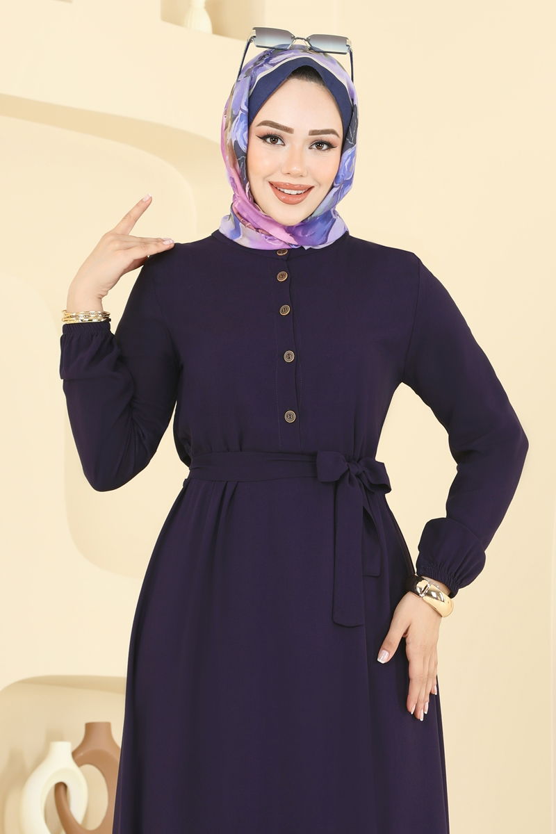 Önden Düğmeli Yarım Yaka Tesettür Elbise - Mürdüm