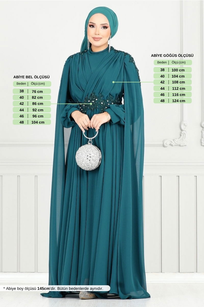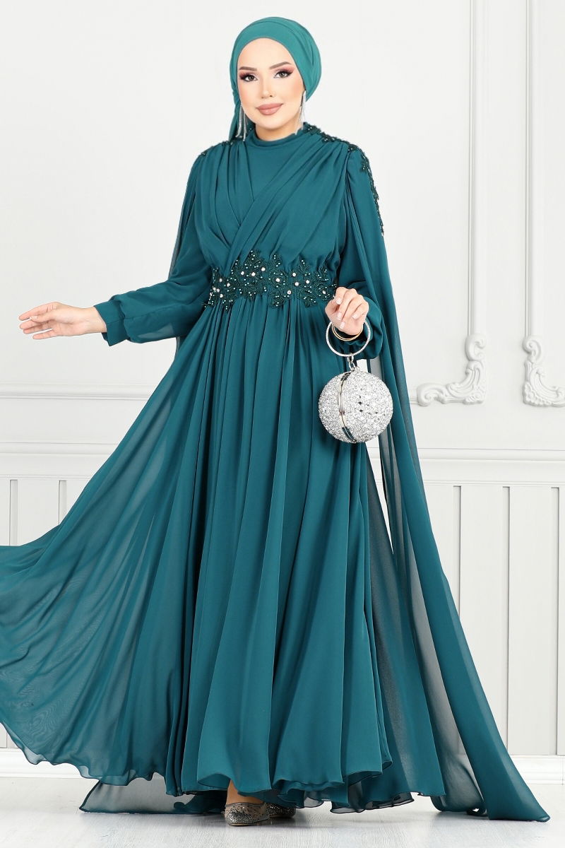 Önü Drapeli Tesettür Abiye 4027YGS898-M Petrol