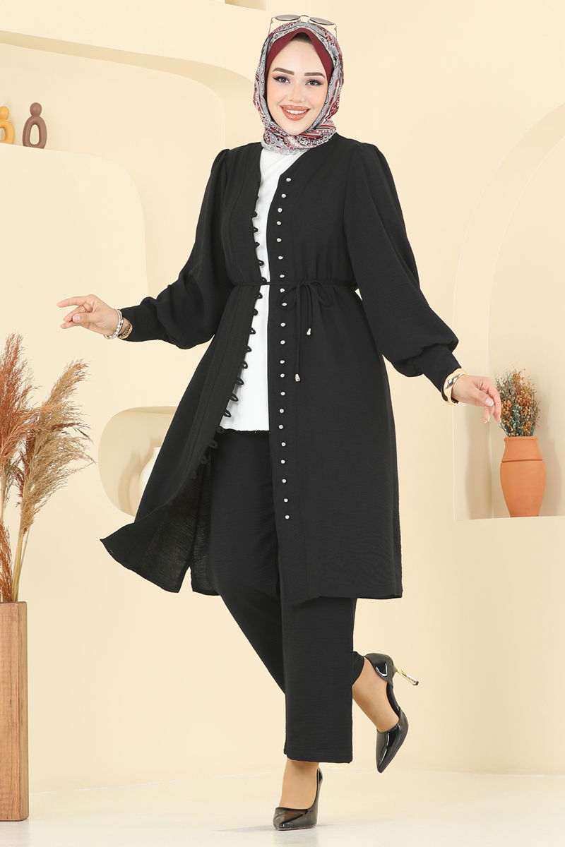 Tasarım Özellikleri : Moda dünyasının yeni dönem tesettür tasarımlarındandır.Yaka tipi bisiklettir.Ön kısımda düğme detayı bulunmaktadır.Astarsızdır.Kemer ürünle birlikte gelir, fakat kullanımı opsiyoneldir.Pantolonun bel kısmında lastik bulunur.Çekim koşullarına göre renk farklılıkları görülebilir.