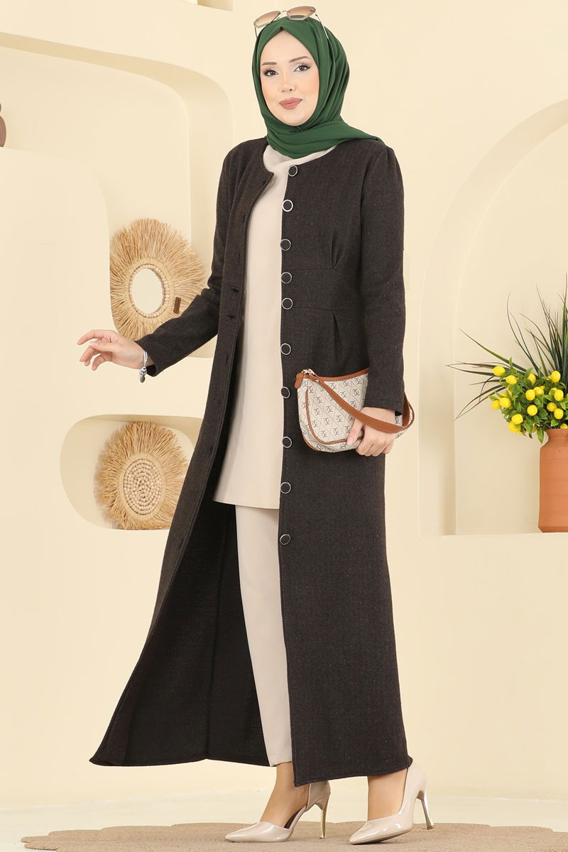 Önü Düğmeli Balıksırtı Elbise 24008UKB139-MS Kahve