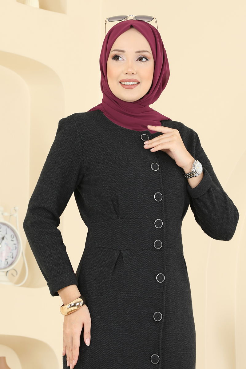 Siyah Renkli Ön Düğmeli Herringbone Elbise