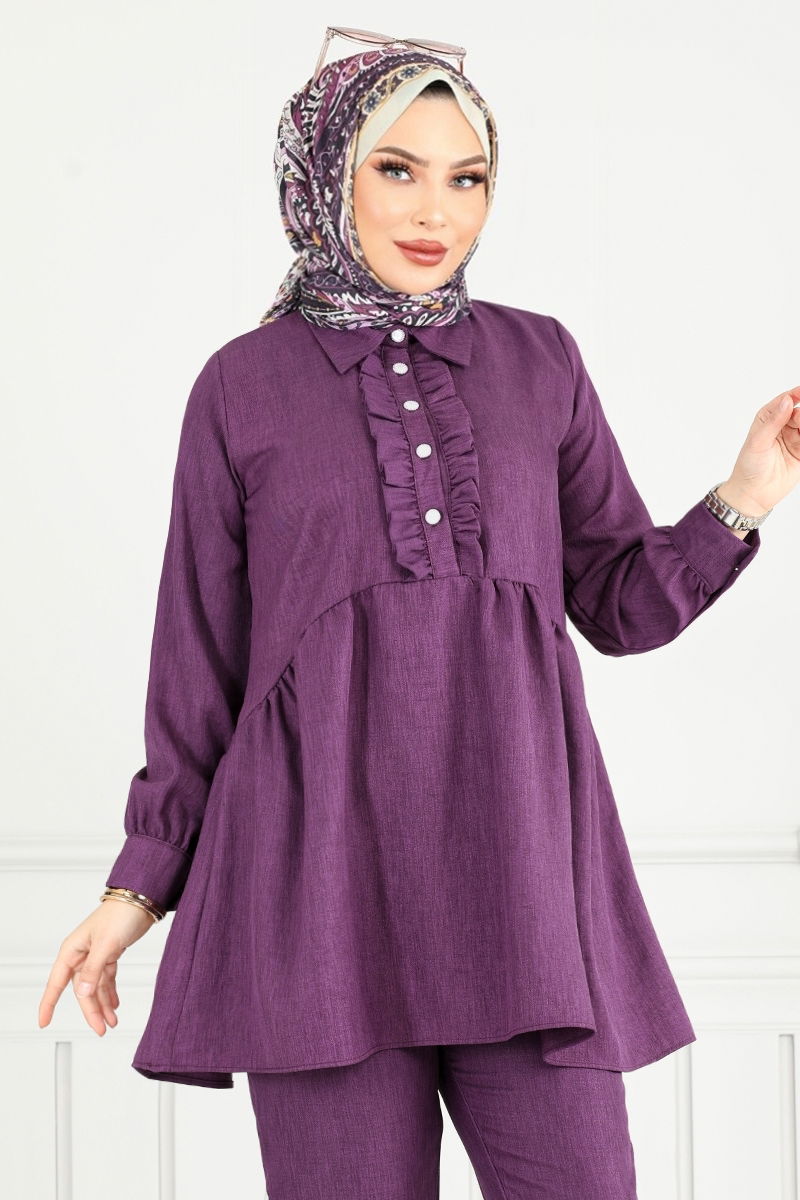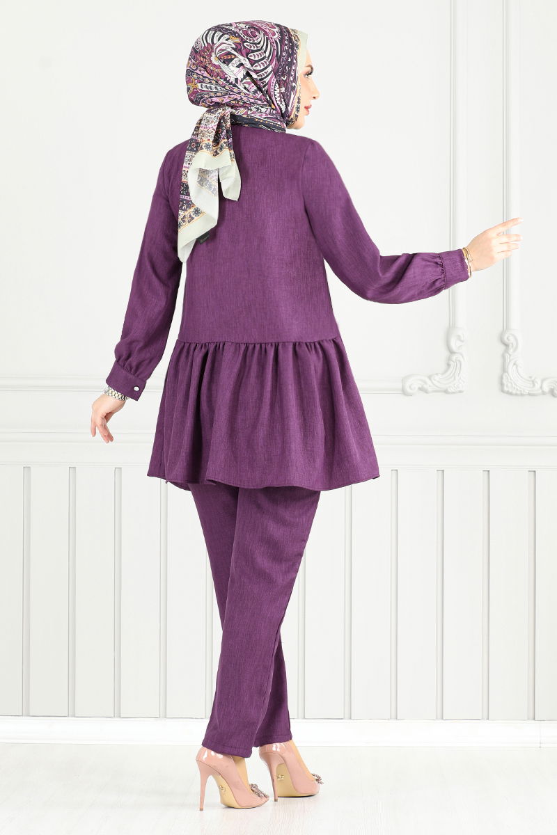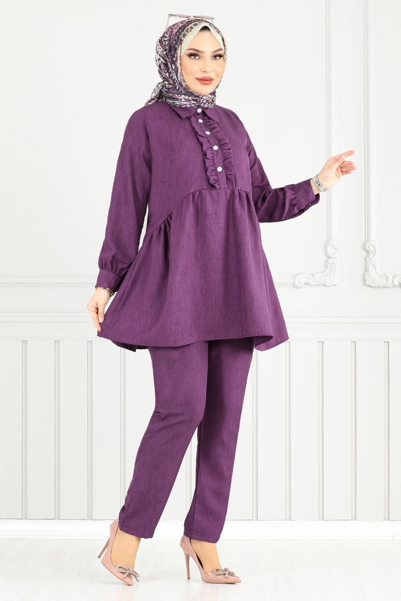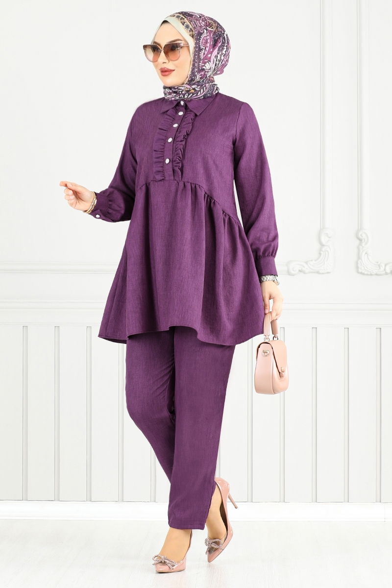 Önü Fırfırlı Keten Takım 6093TGE913-M Mor