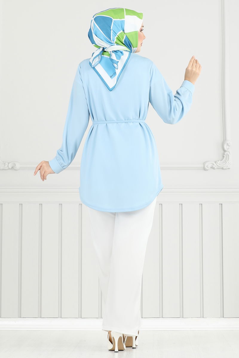 Yarım Hakim yakalı, ön düğmeli tasarımıyla kullanışlı olduğu kadar şık olan bu tesettür takım, her mevsim rahatlıkla kullanılabilir. Scuba Krep kumaşı sayesinde 30 derecede hassas yıkama ile temizlenme imkanı sunar. Set, tunik ve lastik bel pantolondan oluşur. Aktif manşet düğmeleri sayesinde pratik kullanım sağlar. Sete bluz dahil değildir.