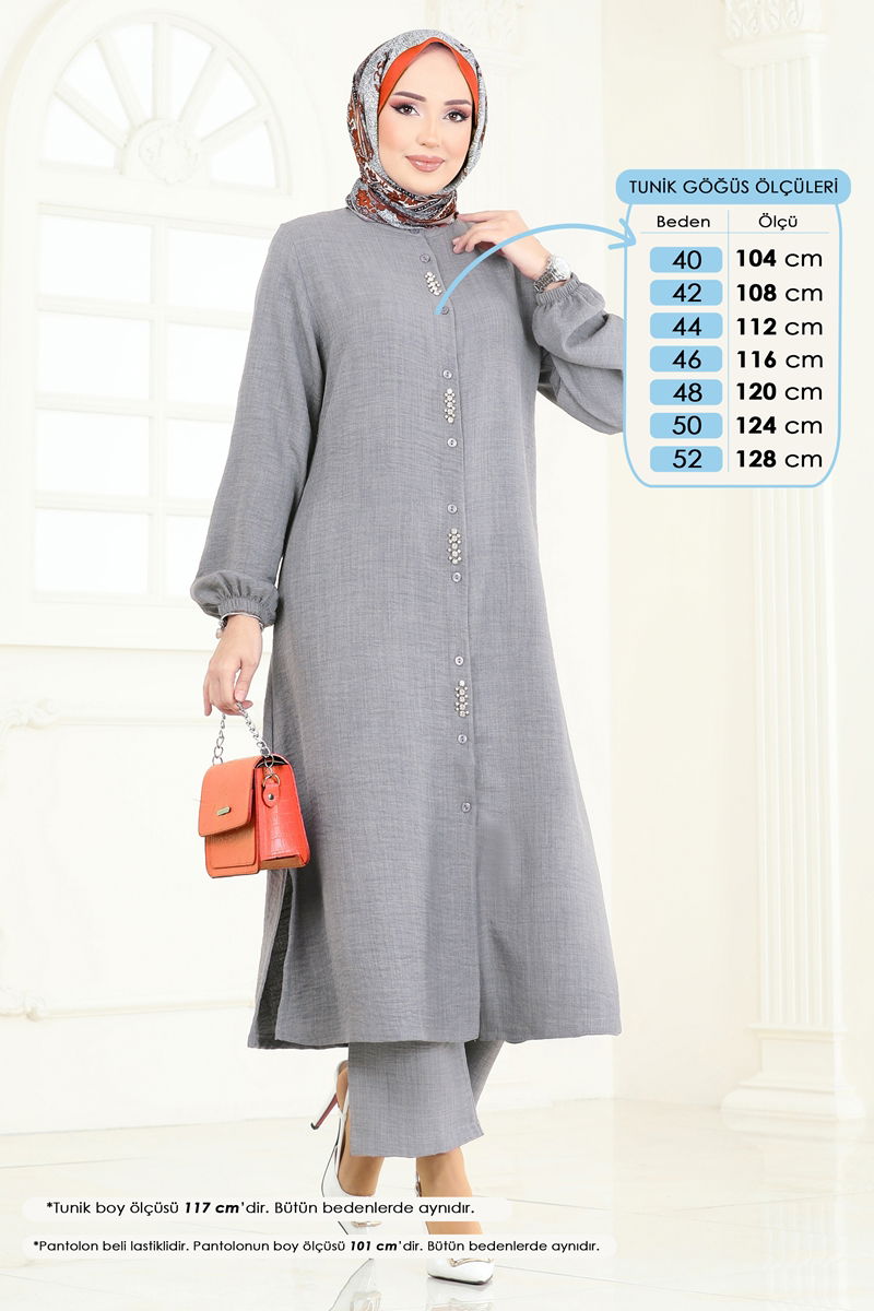 Her mevsim rahatlıkla tercih edilebilen Grili Taş Detaylı Keten Takım, tesettür kıyafet seçeneklerine modern bir çizgi katıyor. Sofia keten kumaşının konforunu yansıtan bu set, düğmeli gömlek yaka tunik ile tamamlanırken, yan yırtmaçlar tuniğe dinamik bir görünüm kazandırıyor. Esnek beli sayesinde pantolon rahat bir kullanım sağlar. Taş işlemeleriyle göz dolduran bu kombinasyon, düşük sıcaklıkta yapılacak hassas yıkama ile temizlenebilmektedir.
