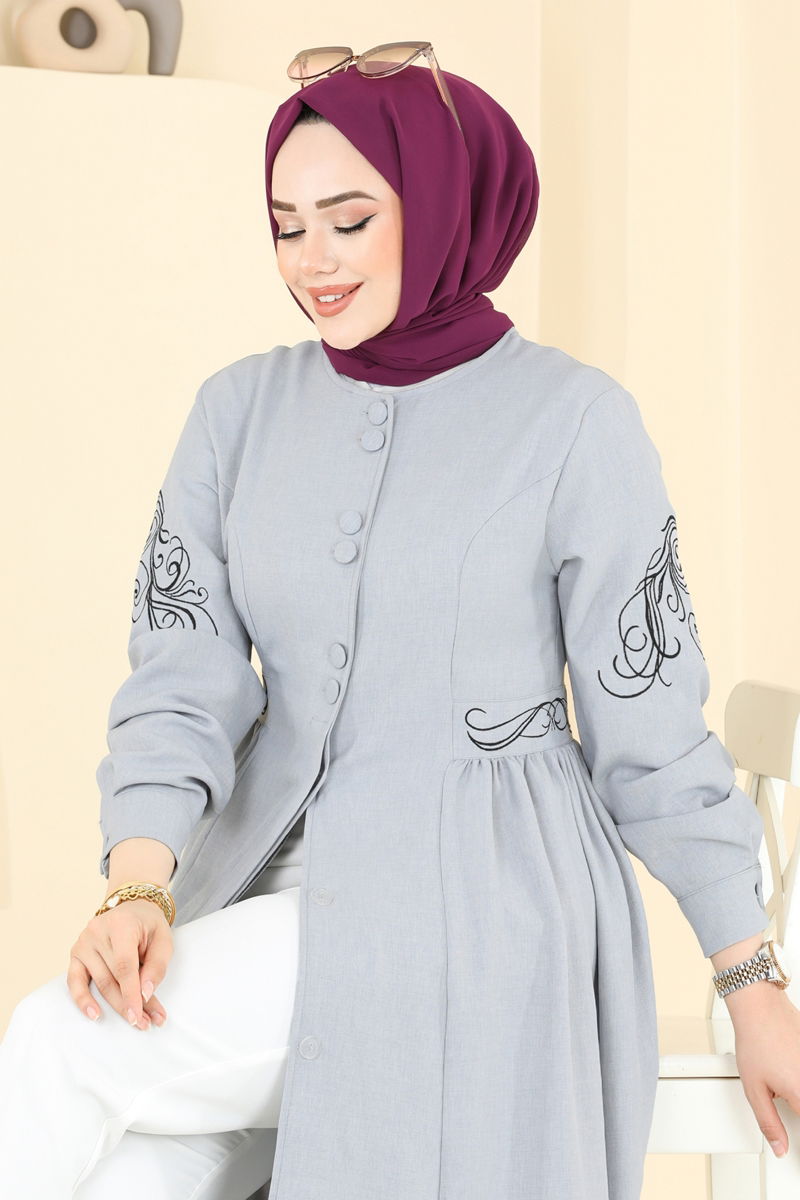 The Embroidered Tesettur Coat is crafted from sofia linen fabric and can be comfortably worn across all seasons. This stylish yet practical item can be washed at 30 degrees on a gentle cycle. It features a bike neck and front buttons for ease of use, while its unlined design keeps it light. Embellished with embroidered details and active cuff buttons. Standard measurements: Height: 165 cm, Chest: 88 cm, Waist: 68 cm, Hips: 99 cm, Weight: 56 kg.
