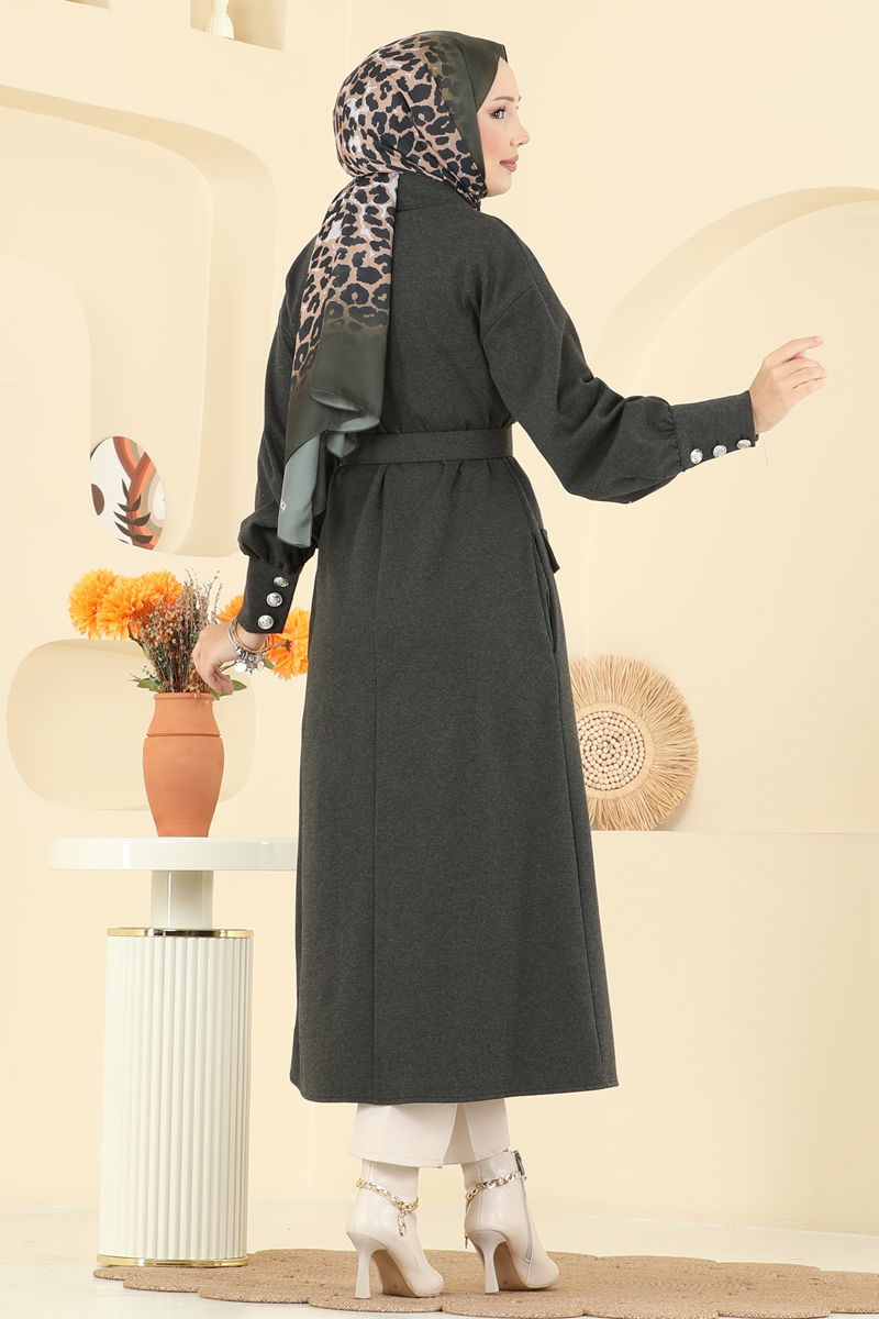 Product Feature : It is a new season hijab fashion product. There are two buttons available from the front. There is a hidden pocket in the product. The product has a Double-breasted collar. Unlined. There is no belt bridge on the product. Belt included, optional not available. Brooch is not included in the product. Pocket details are accessories. Cuff buttons are active. There may be a tonal difference in the product due to concept photo shoots.