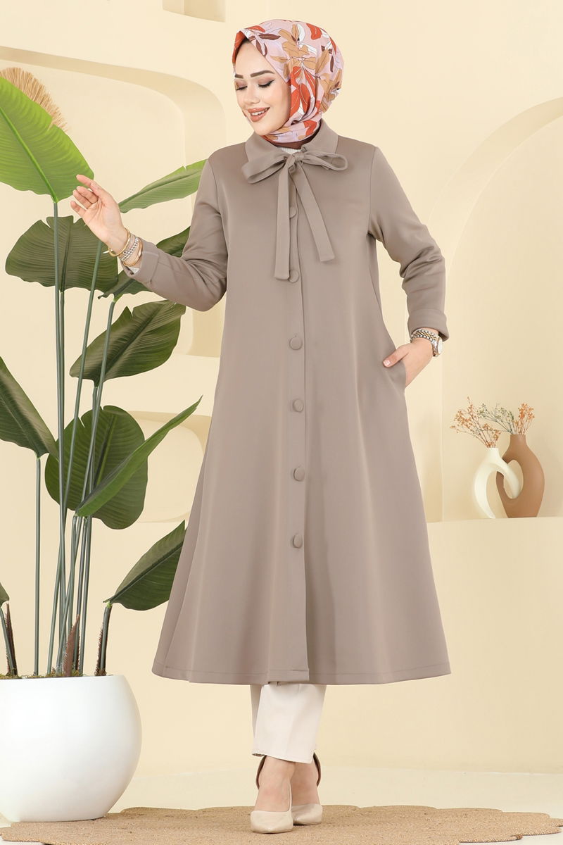 Chic and functional: Bow Collar Detailed Abaya! This elegant hijab abaya can be comfortably worn in all four seasons. Made from delicate scuba fabric, it maintains its shape for long-lasting wear. Recommended to be washed at 30 degrees with gentle care. With shirt collar and front button details, it blends classic and modern lines. Its lining-free structure and hidden pocket detail offer practical use, while its drawstring design provides a perfect fit.