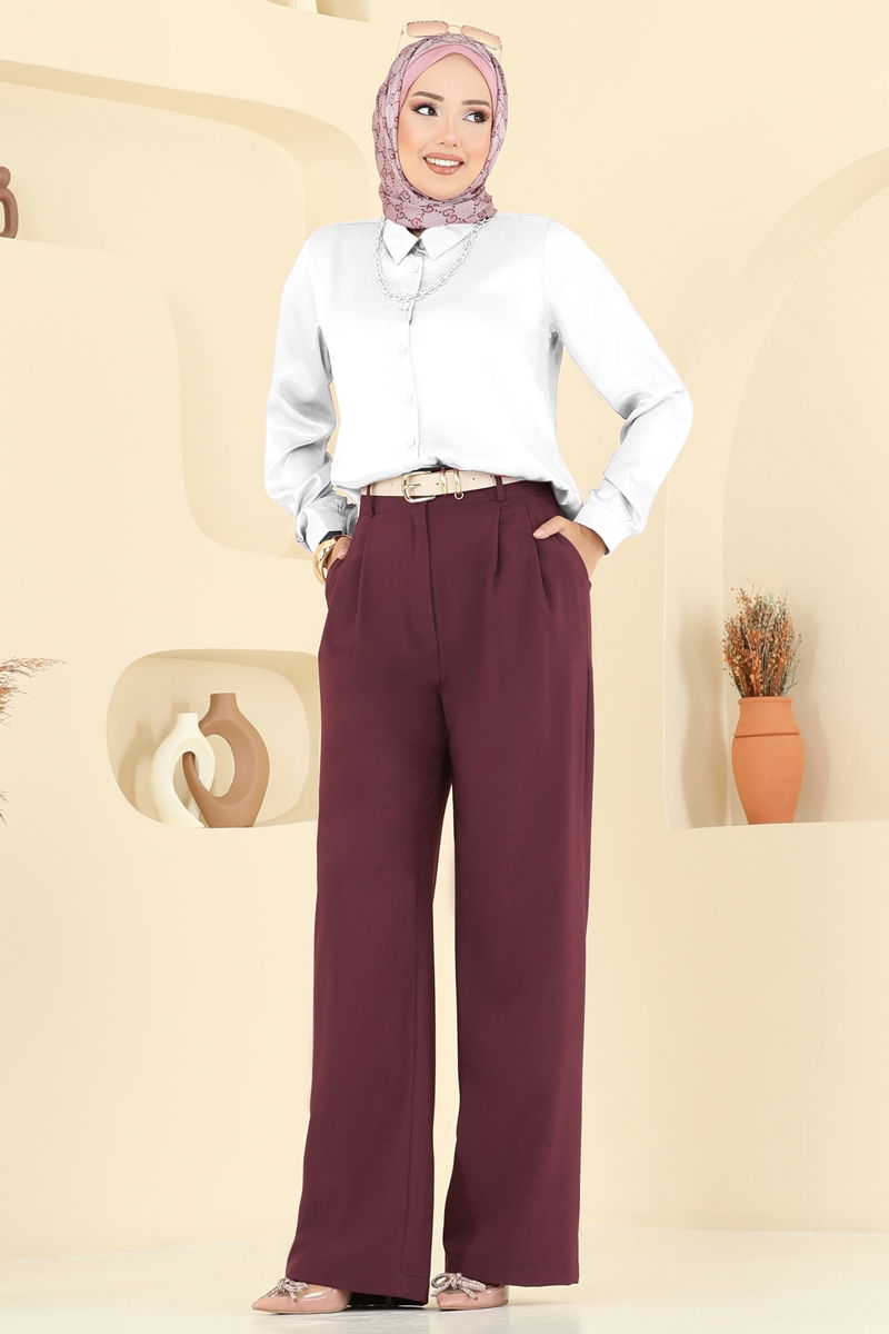 Palazzo Bordo Dokuma Pantolon, yılın dört mevsimi giyim için uygundur ve modern tesettür giyime uyumludur. 30 derecede hassas yıkama yapılabilmekte, kullanışlı düğme detayları ile ön plana çıkmaktadır. (Üzerindeki pantolon 38 bedendir.)