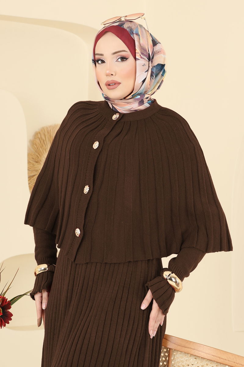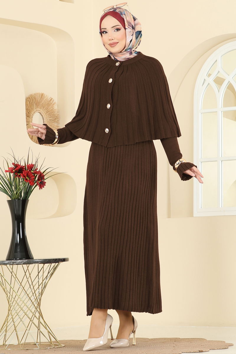 Pelerinli Triko Elbise Takım - Kahve Rengi