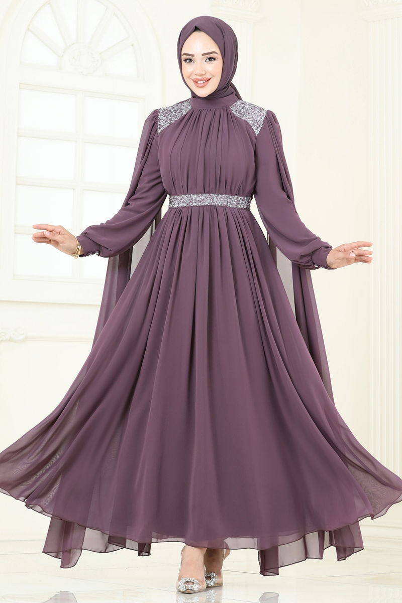 Pelerinli Şifon Abiye 7101AB368-MS Koyu Lila