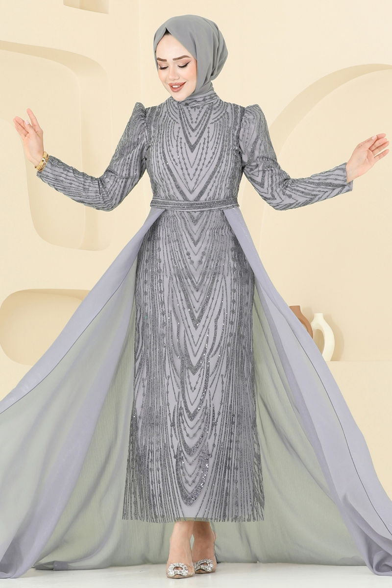 Pelerin Detaylı Gümüş Simli Abiye Elbise