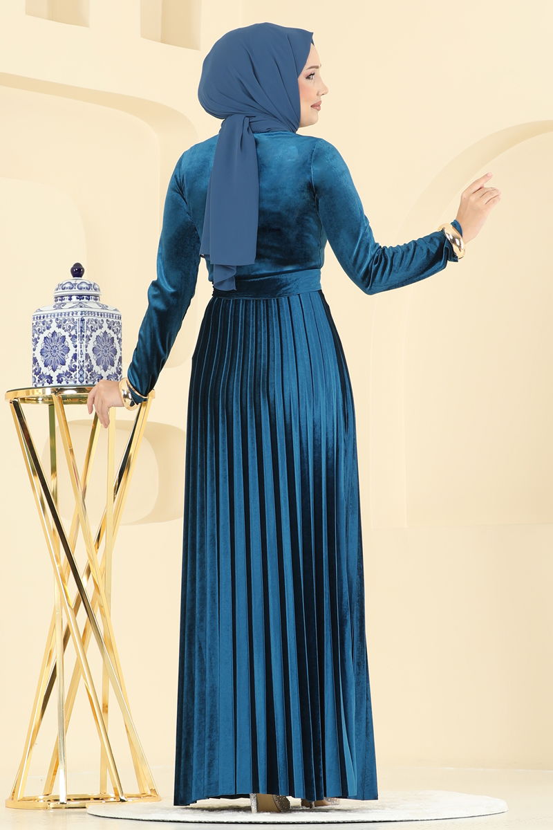 Pilise Detaylı Kadife Elbise 2047MEY846-MS Petrol