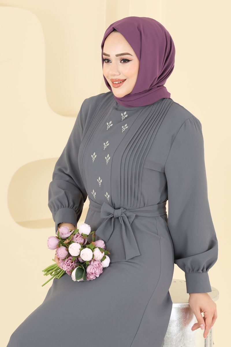 Pilise Detaylı Krep Elbise 309ASN888-MS Gri