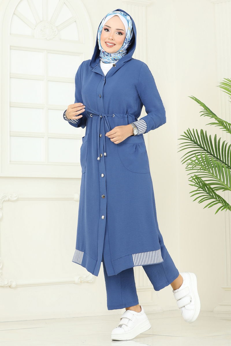 Ürün Açıklaması: En yeni tesettür modasıdır. Bel kısmı bağcıklıdır. Kapşonlu bir yaka tasarımına sahiptir. Ön kısım düğmeli olarak tasarlanmıştır. Astarı yoktur. Cepleri bulunmaktadır. Pantolon beli lastikli yapıdadır.Fotoğraf çekimlerine özel renk tonu farklılık gösterebilir.