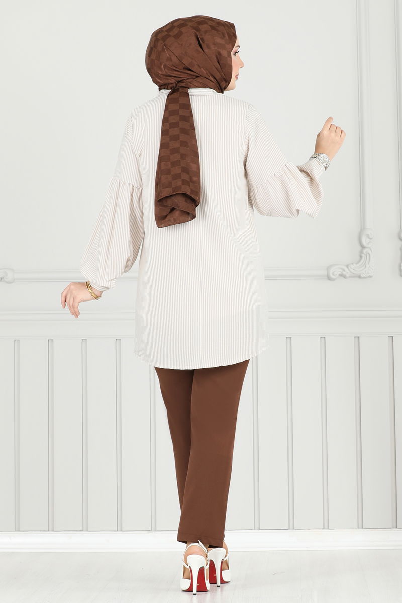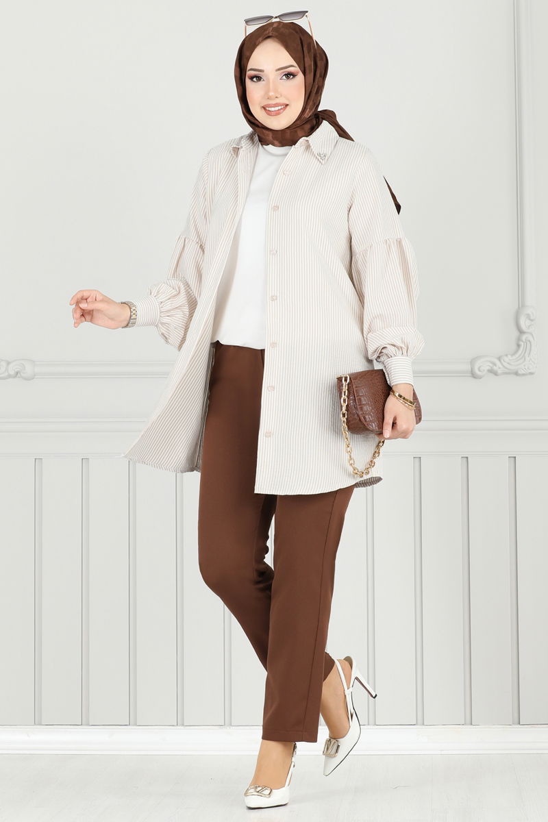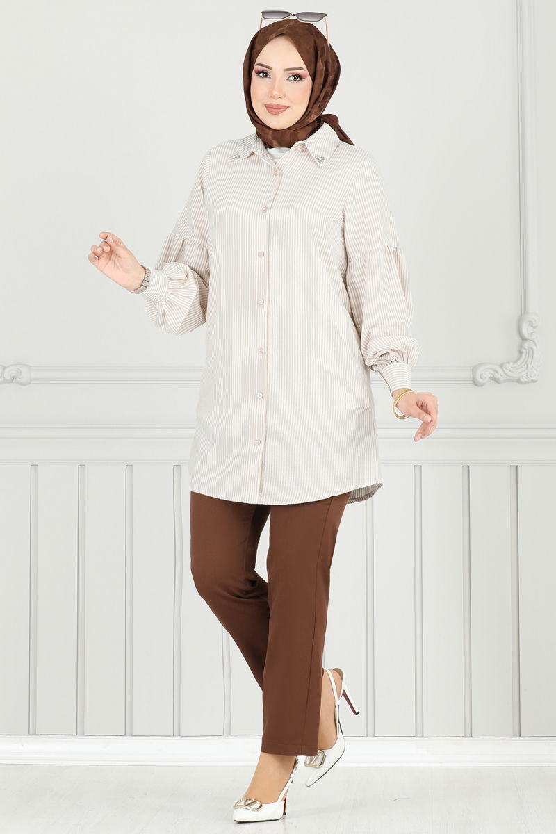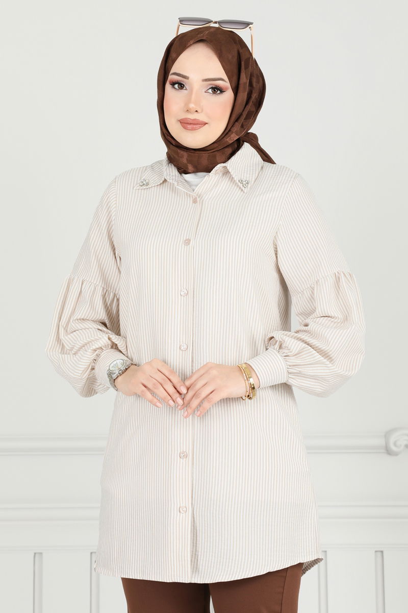 Embellished Collar Striped Shirt, a must-have for every season! This model, suitable for all seasons, is made from crepe fabric requiring gentle wash. It features stunning stone and pearl details for an eye-catching elegance. The shirt has button-up front and functional cuff buttons. An ideal choice for all-year wear, this shirt offers a stylish and comfortable option for modest attire.