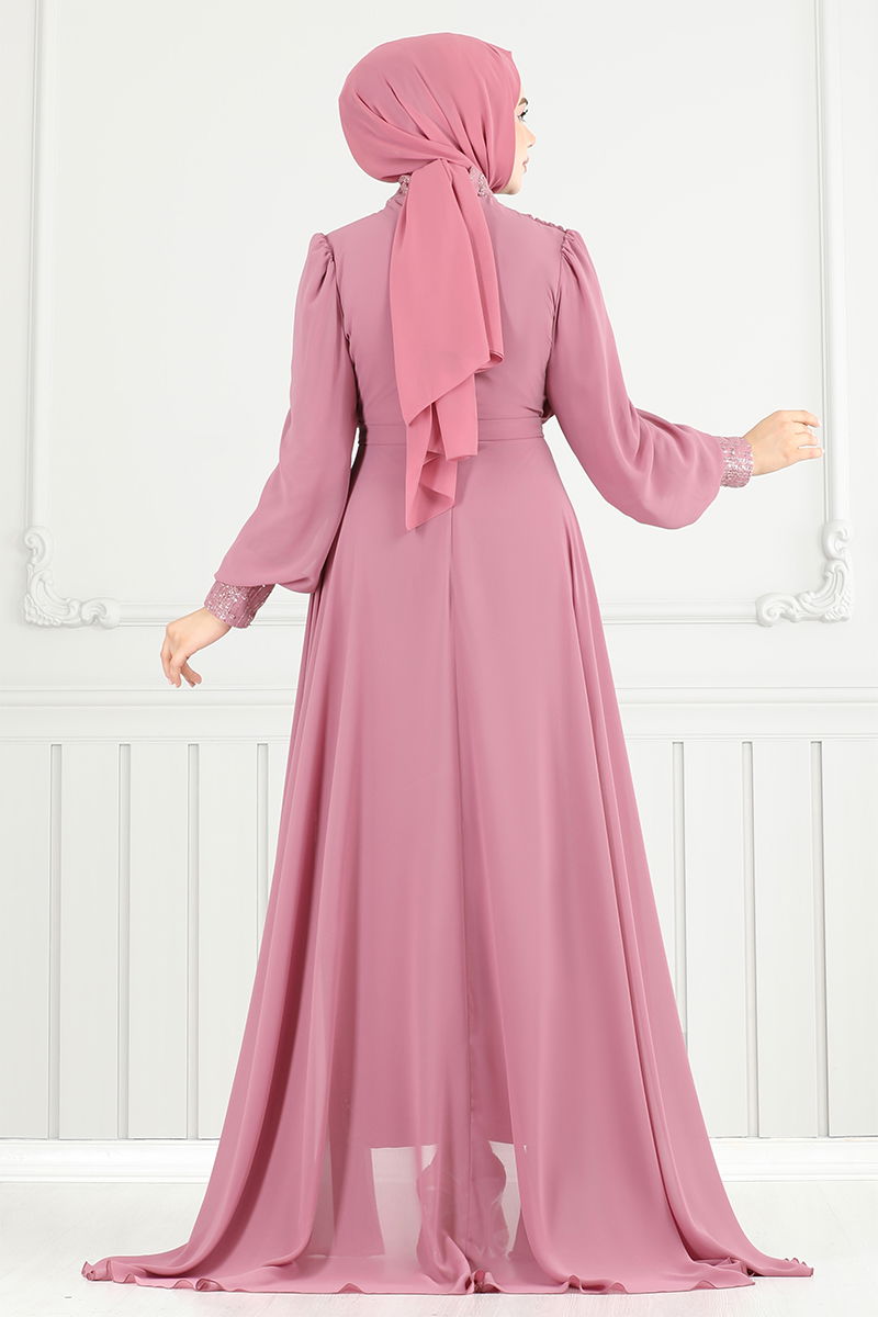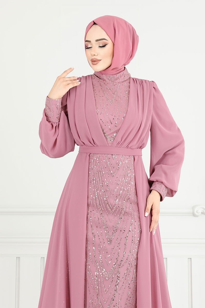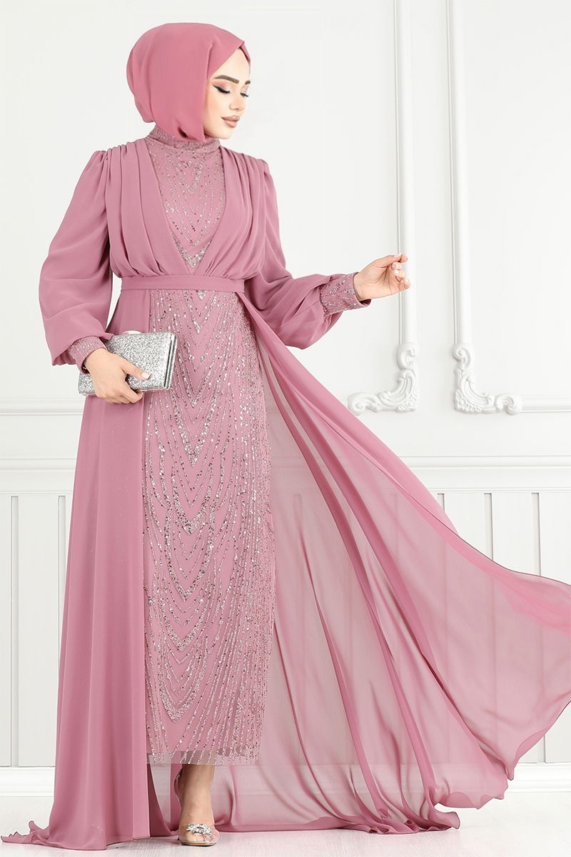 Sim Detay Pelerinli Abiye 4026YGS898-M Pudra