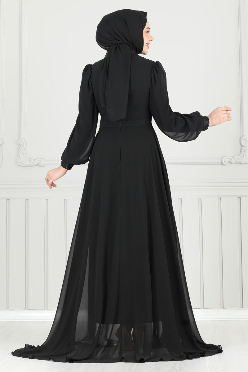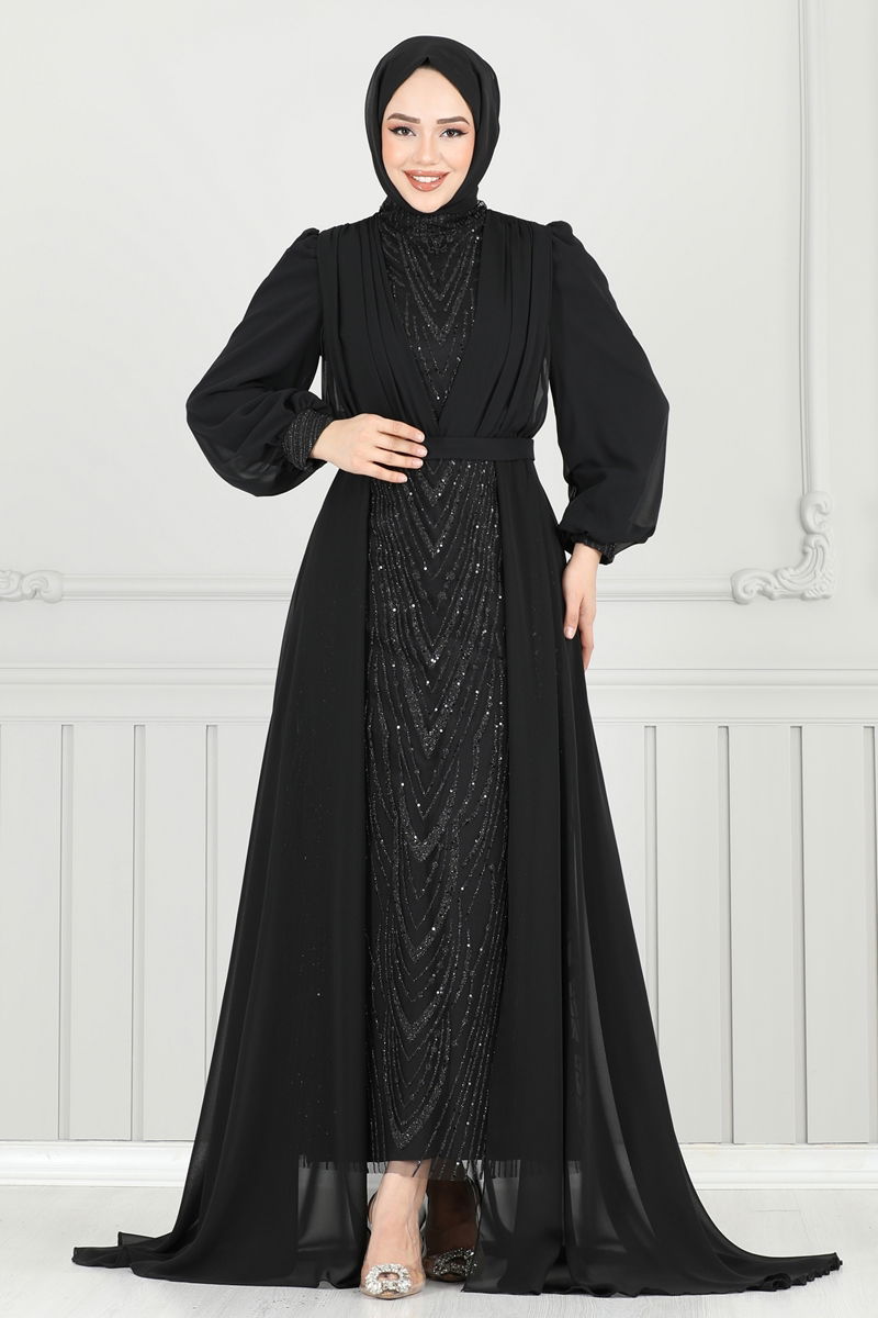 Sim Detay Pelerinli Abiye 6630YG95-MS Siyah