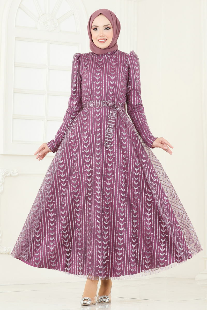 Simli Tül Tesettür Abiye 5688EDF311-MS Koyu Gül Kurusu