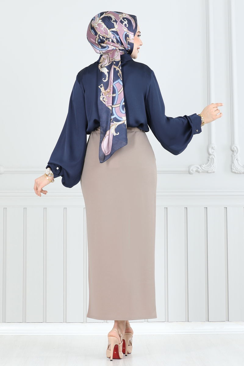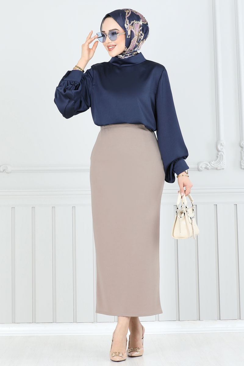The Belted Pencil Skirt is a stylish and comfortable choice specifically designed for modest wear. This skirt, which can be worn in all seasons, is made from durable Dabıl fabric. It offers a lightweight and comfortable experience with its unlined design. It can be washed at 30 degrees on a gentle cycle. The elastic waist provides a comfortable fit. (The product on the model is size 38.)