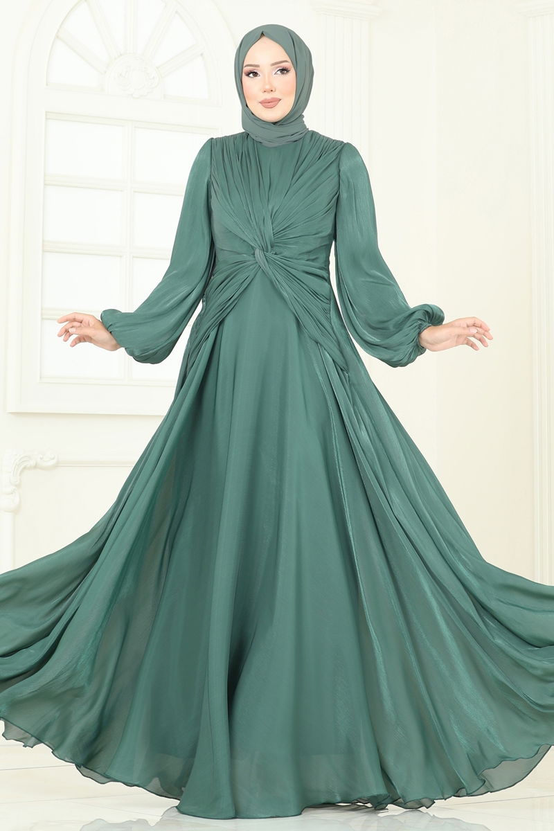 SUAL Drapeli Ön Detaylı Şifon Abiye - Nane Yeşili