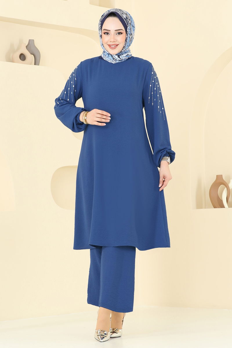 Ürün Detayları : Modaya uygun tesettür tarzı. Ürünün arkasında bir düğme mevcuttur ve baştan geçirilerek giyilir. Bisiklet yaka tasarımındadır ve astarsızdır. Taş detaylar yapışkanla sabitlenmiştir. Pantolon beli lastiklidir ve paçaları lastiklidir. Renk tonları çekim koşullarına göre değişiklik gösterebilir.