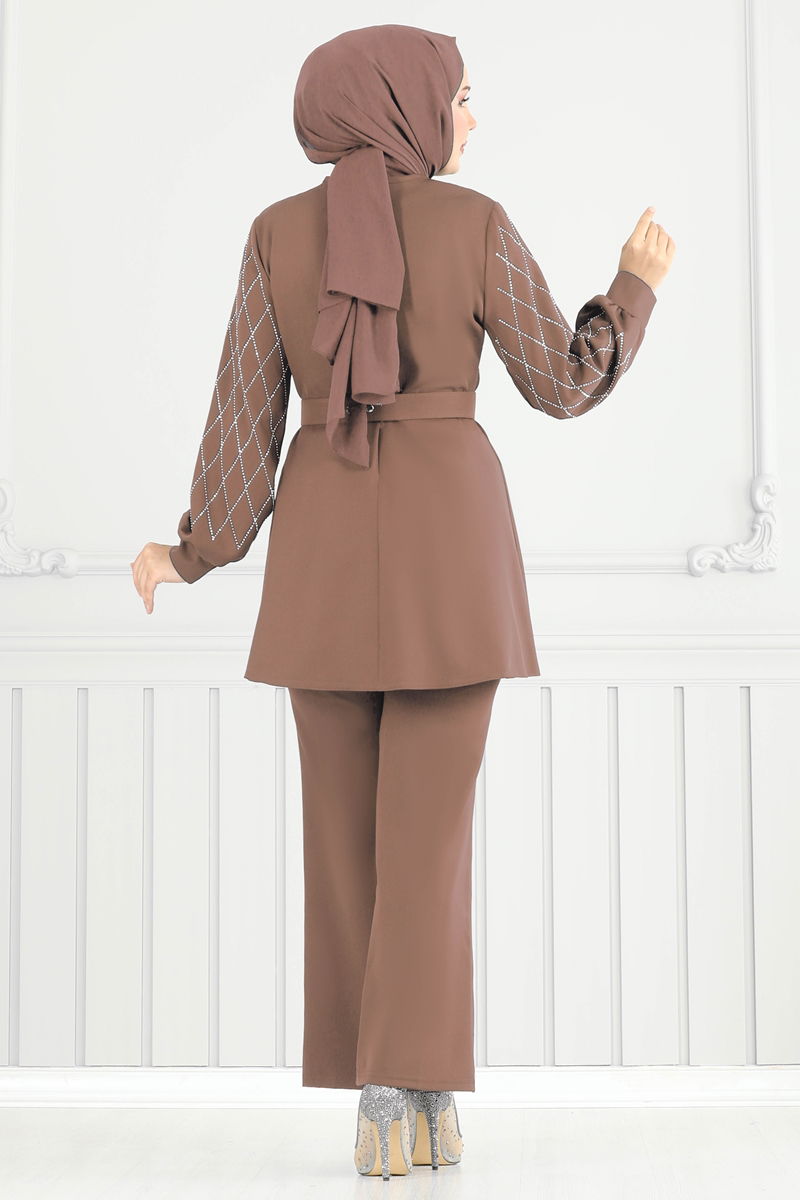 Ürün Açıklaması: Moda tesettür giyim koleksiyonunun yeni ürünüdür. Bisiklet yaka tasarıma sahiptir. Astar içermez. Arka kısımda fermuar bulunmaktadır. Taş detaylar yapışkanlıdır. Ürün bele oturan dikişlidir ve kemer içermektedir, bu kemer isteğe bağlı çıkarılabilir. Pantolonun bel kısmı lastiklidir. Çekimler sebebiyle renk tonlarında farklılık gösterme ihtimali vardır.