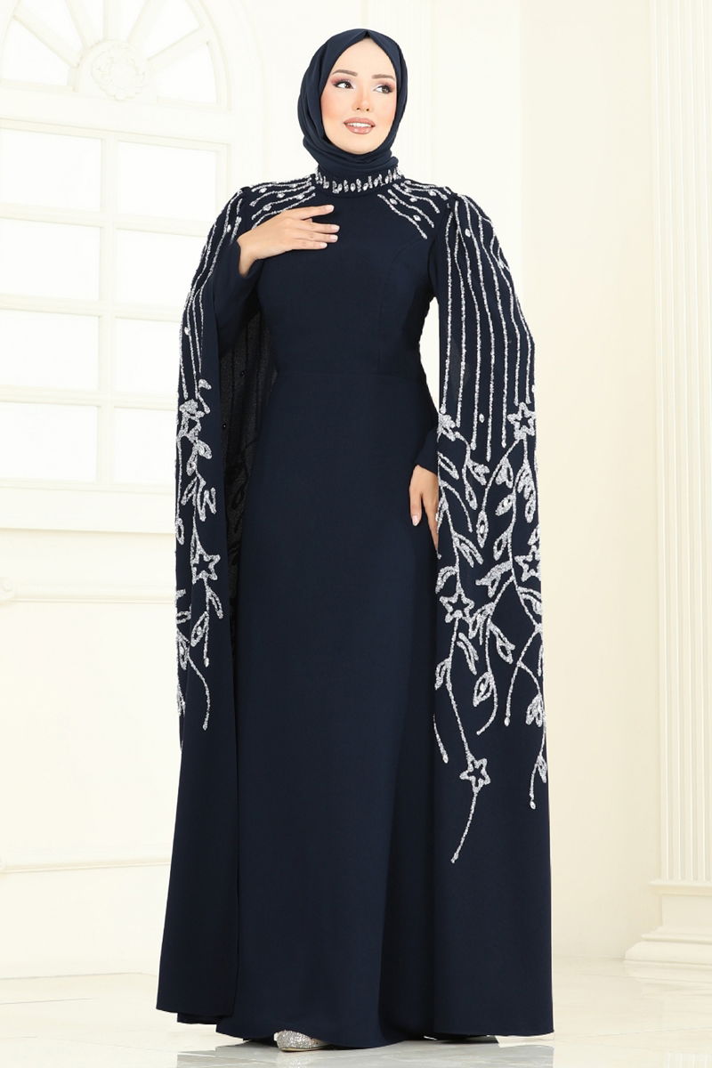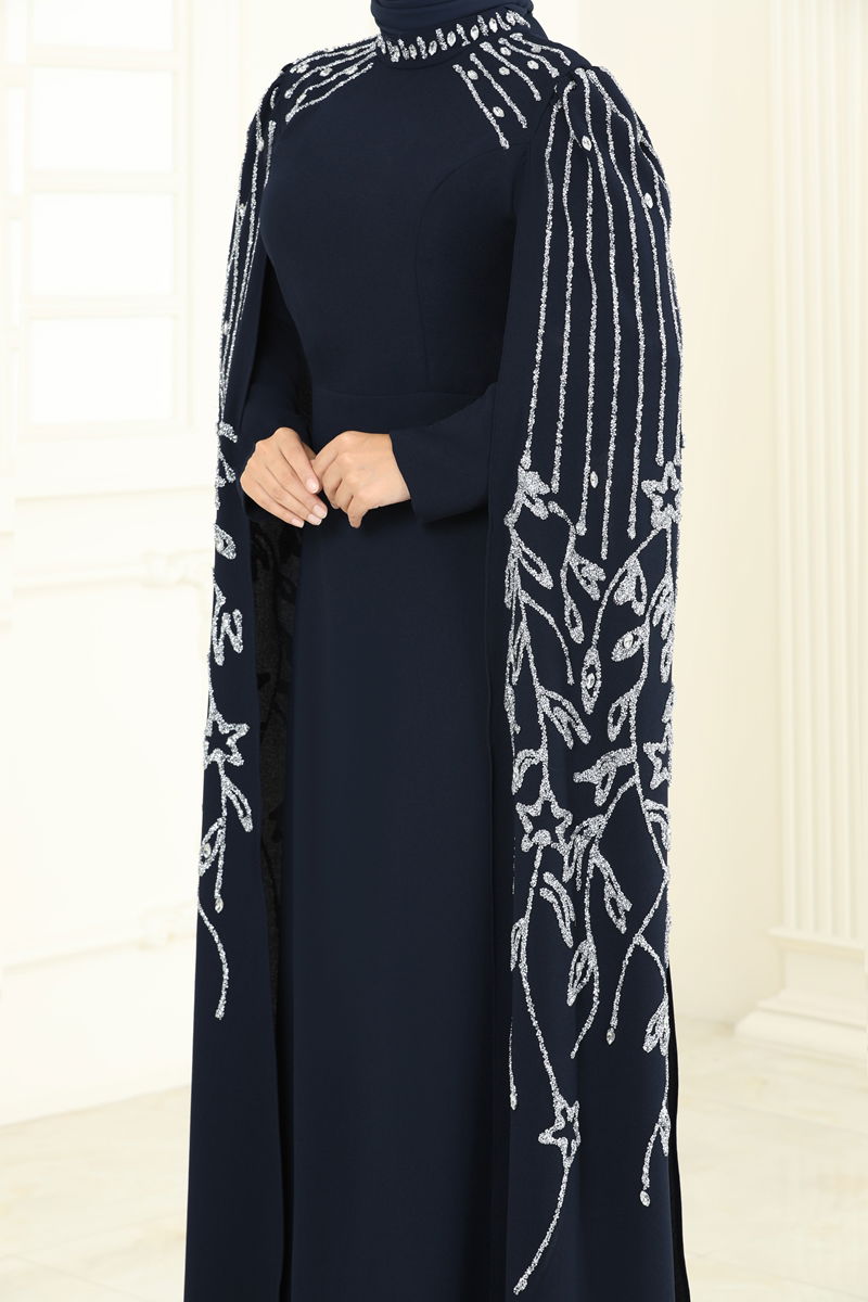 Abiye Taşlı ve Pelerinli Lacivert Elbise