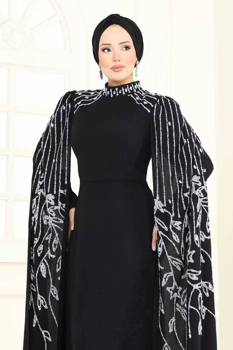 Taş Detay Pelerinli Abiye 5696EDF311-MS Siyah