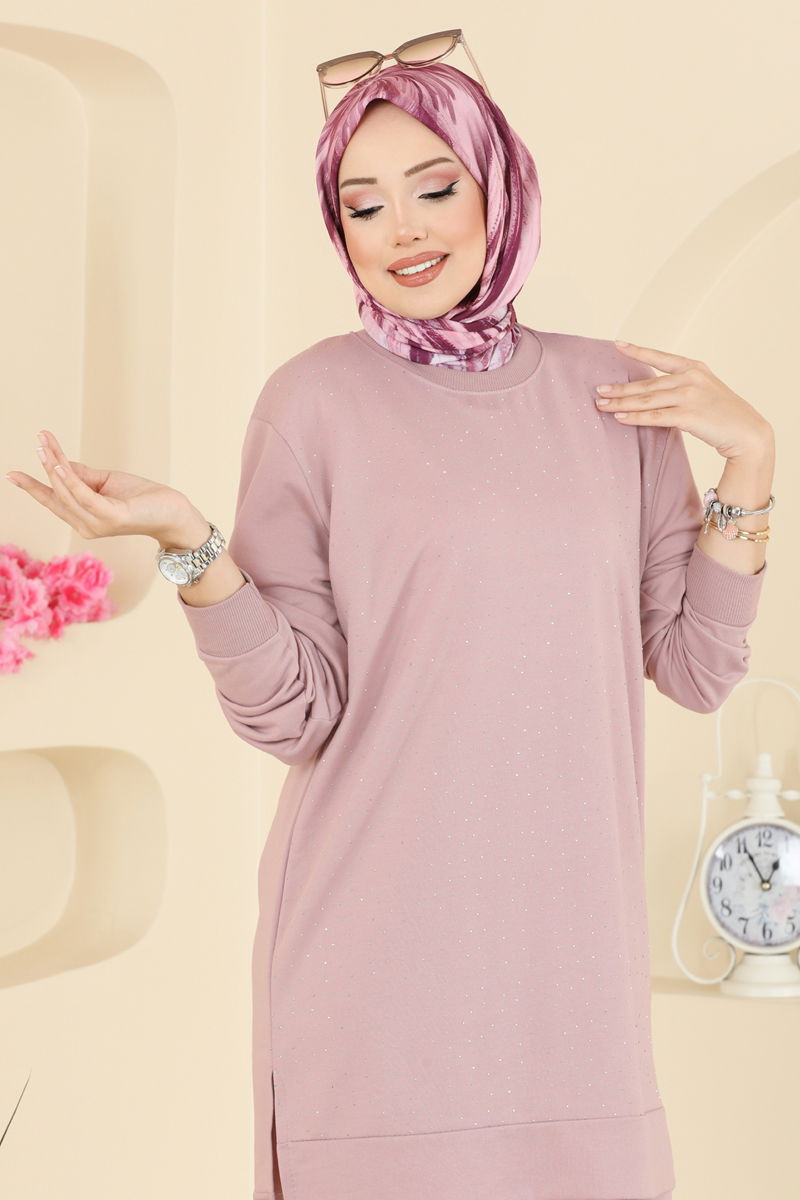 Ürün Karakteristiği: Tesettür moda ürünlerinin yeni sezon tasarımı. Bisiklet yaka tasarımı ve yırtmaç ayrıntısı mevcut. Astar kullanılmamıştır. Taşlar yapışkan metotla eklenmiştir. Pantolonun bel kısmı esnektir. Fotoğraf çekimi sebebiyle renklerde farklılık gözlenebilir.Model Ölçüleri: Boy: 165 cm, Göğüs: 80 cm, Bel: 68 cm, Kalça: 96 cm, Ağırlık: 54 kg.