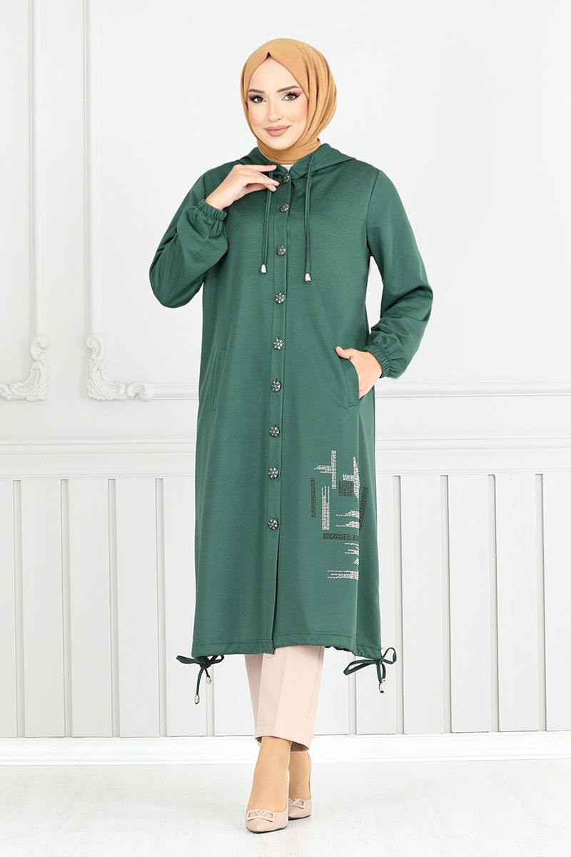 Taş Detaylı Mevsimlik Kap model tesettür ürünüdür. Dört Mevsim sezonunda kullanılabilir. Baskılı ürünlerde ürün ters çevirilip yıkanmalıdır ve tersten ütülenmelidir. Dabıl kumaştan imal edilmiştir. Ürün Kapşonlu yakadır. Ürün Önden düğmelidir. Astarsızdır. (Modelin üzerindeki ürün 38 bedendir.) Kapşon ürüne dikilidir. Taşlar yapıştırmadır. Cep mevcuttur.