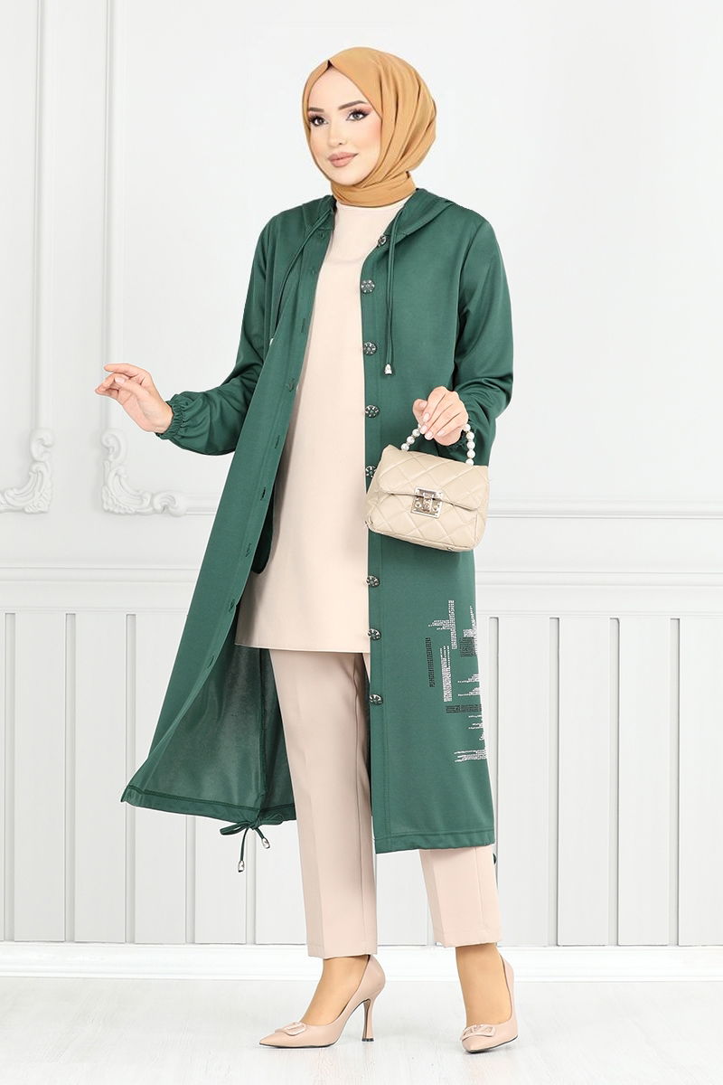Ürün Özelliği : Yeni sezon tesettür moda ürünüdür. Ürün Kapşonlu yakadır. Ürün Önden düğmelidir. Astarsızdır. Bağcık detayları aksesuardır. Kapşon ürüne dikilidir. Taşlar yapıştırmadır. Cep mevcuttur.Konsept fotoğraf çekimlerinden dolayı üründe ton farklılığı olabilir.